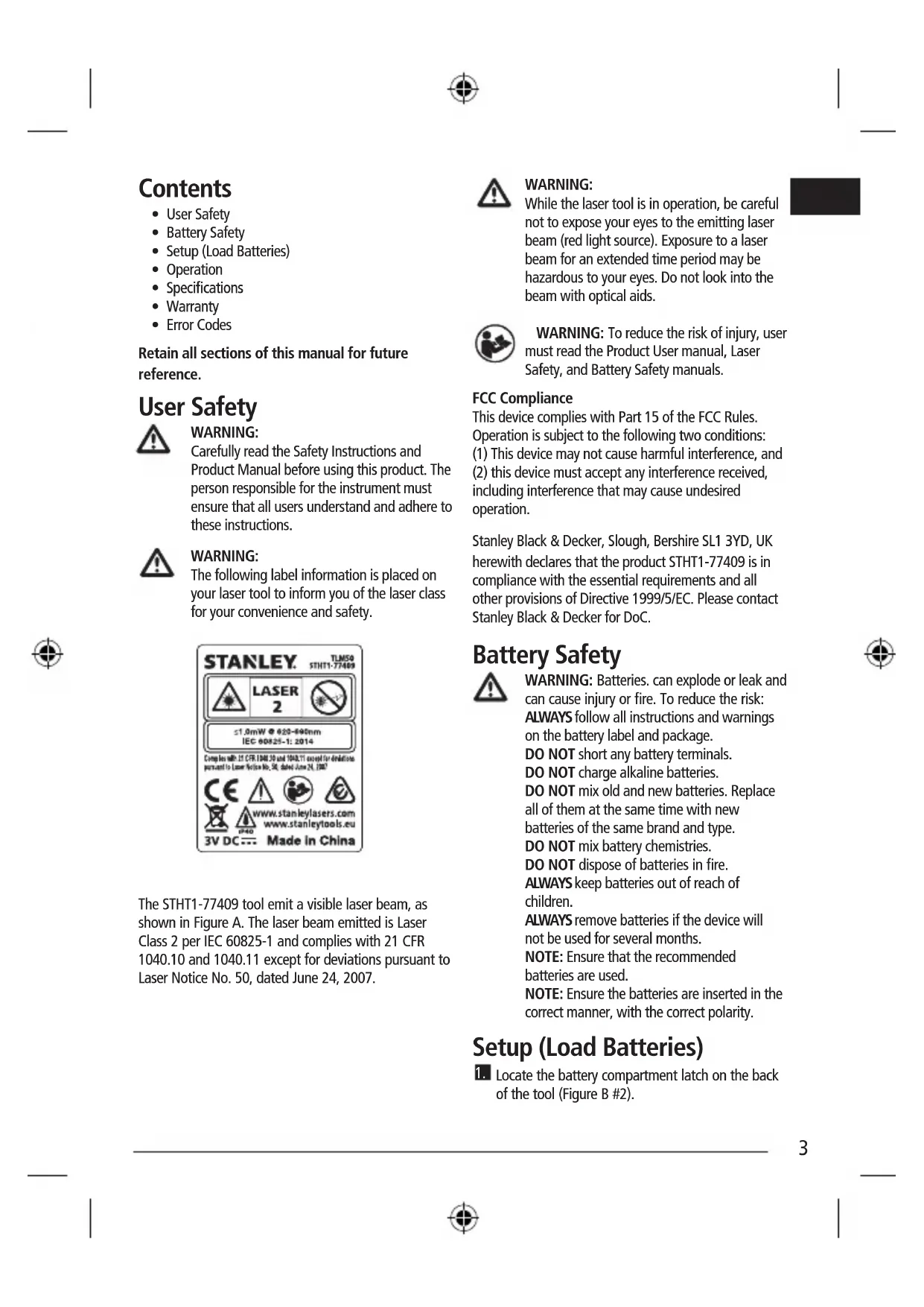 must read the Product User manual, Laser Safety, and Battery Safety manuals. FCC Compliance This device complies with Part 15 of the FCC Rules. Operation is subject to the following two conditions: (1) This device may not cause harmful interference, and (2) this device must accept any interference received, including interference that may cause undesired operation. Stanley Black & Decker, Slough, Bershire SL1 3YD, UK herewith declares that the product STHT1-77409 is in compliance with the essential requirements and all other provisions of Directive 1999/5/EC. Please contact Stanley Black & Decker for DoC. Battery Safety