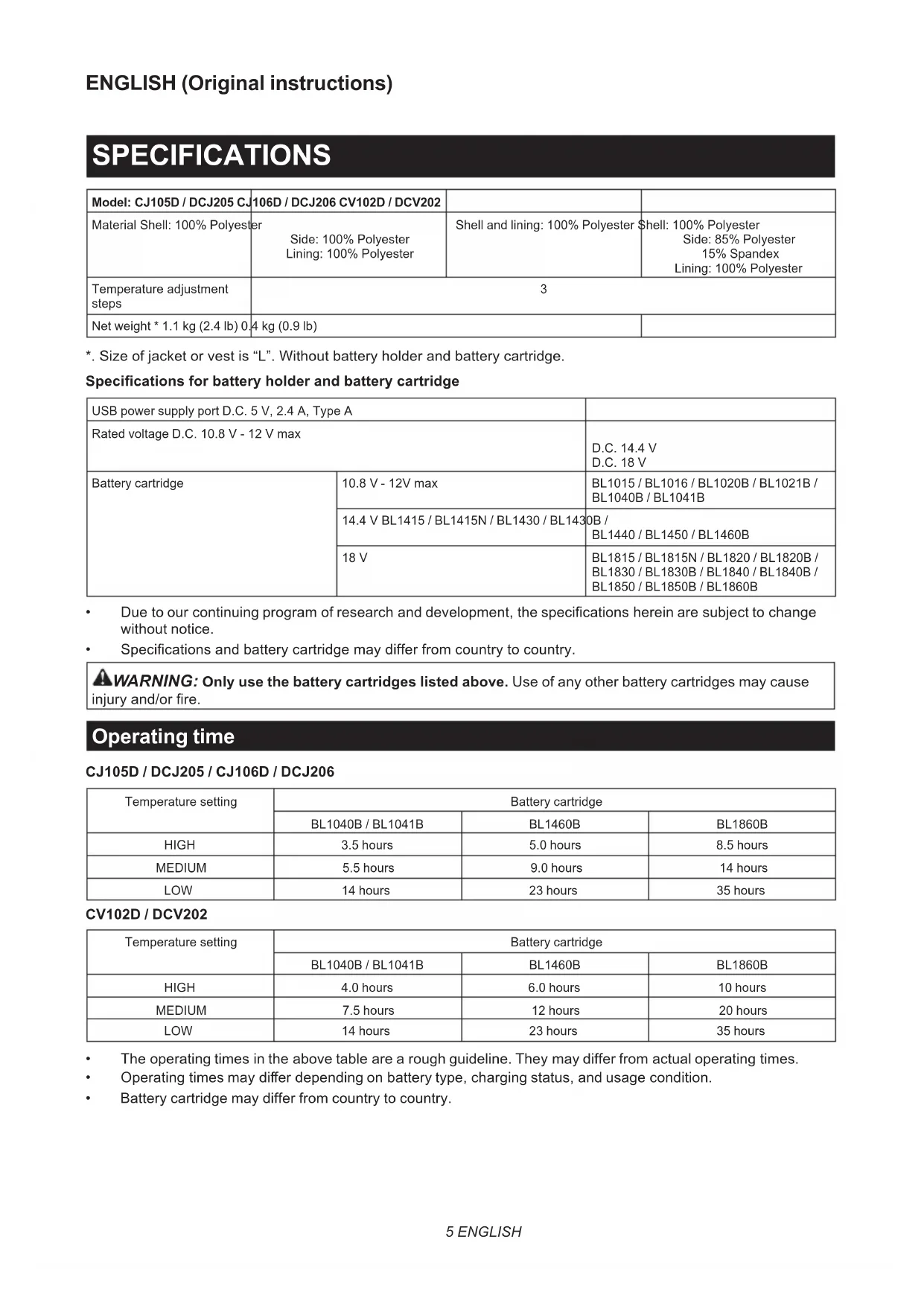 Net weight * 1.1 kg (2.4 lb) 0.4 kg (0.9 lb) *. Size of jacket or vest is “L”. Without battery holder and battery cartridge. Specications for battery holder and battery cartridge USB power supply port D.C. 5 V, 2.4 A, Type A Rated voltage D.C. 10.8 V - 12 V max D.C. 14.4 V D.C. 18 V Battery cartridge 10.8 V - 12V max BL1015 / BL1016 / BL1020B / BL1021B / BL1040B / BL1041B