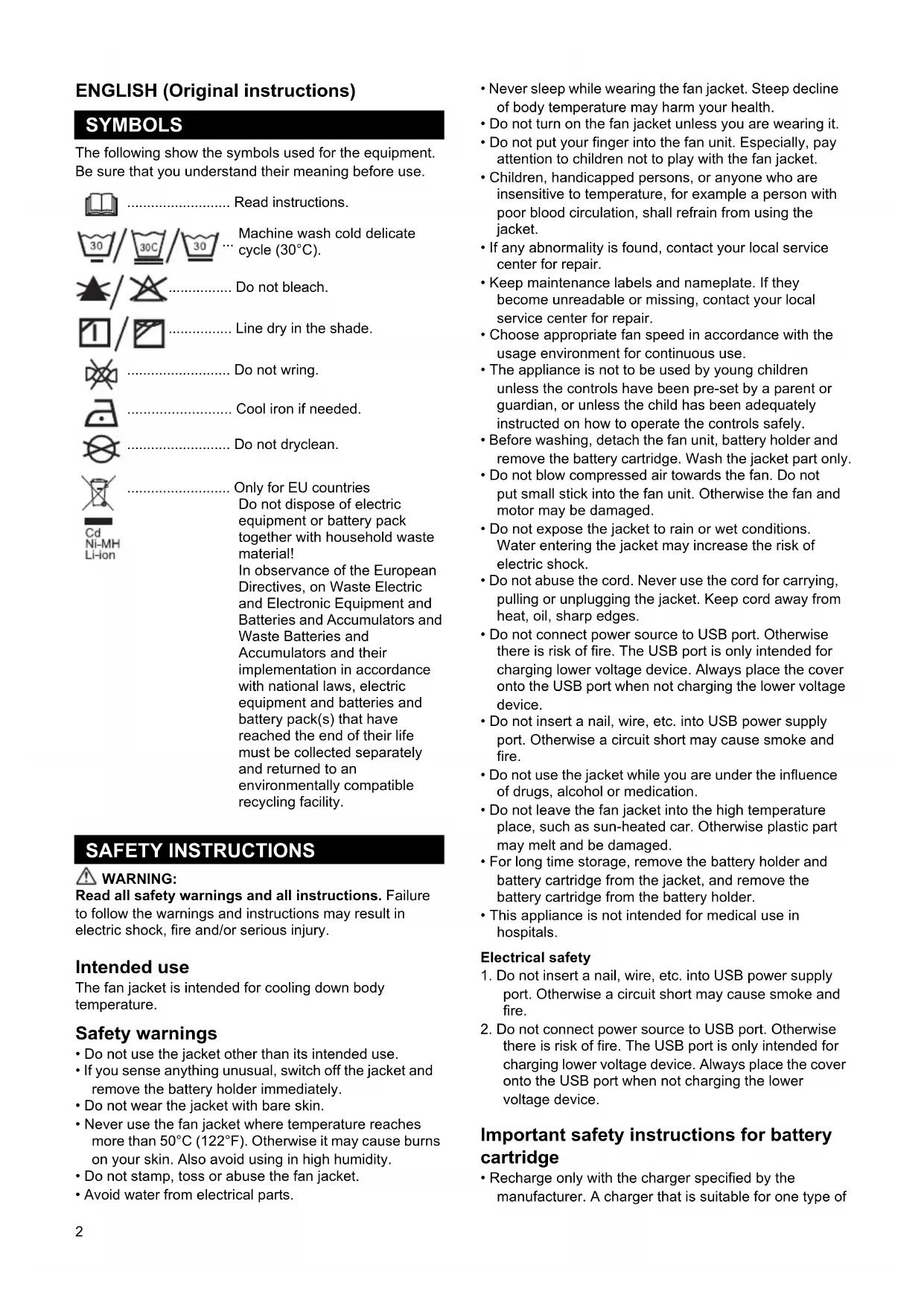 - Do not leave the fan jacket into the high temperature place, such as sun-heated car. Otherwise plastic part may melt and be damaged.
