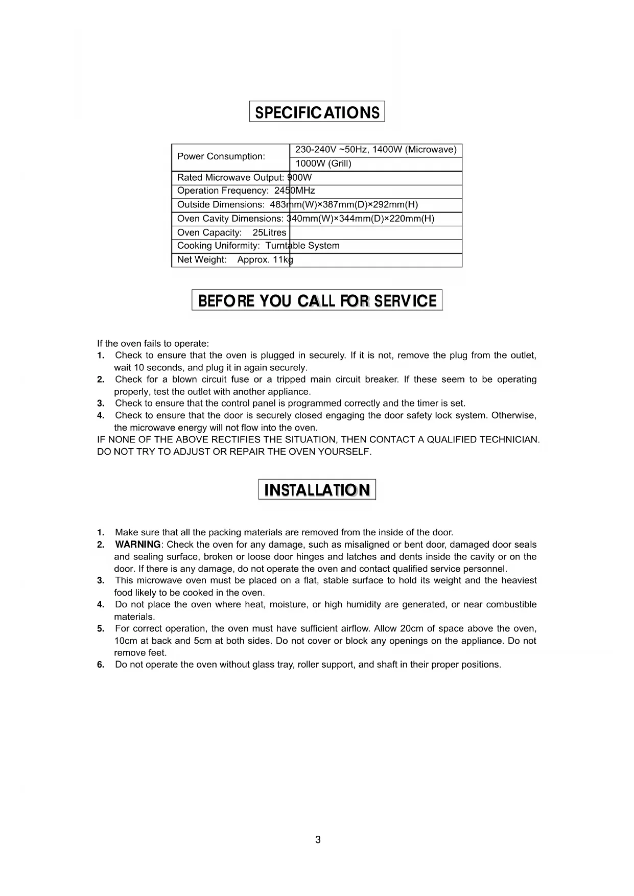 2Power Consumption: 230-240V ~50Hz, 1400W (Microwave) 1000W (Grill) Rated Microwave Output: 900W Operation Frequency: 2450MHz Outside Dimensions: 483mm(W)×387mm(D)×292mm(H) Oven Cavity Dimensions: 340mm(W)×344mm(D)×220mm(H) Oven Capacity: 25Litres Cooking Uniformity: Turntable System Net Weight: Approx. 11kg If the oven fails to operate: