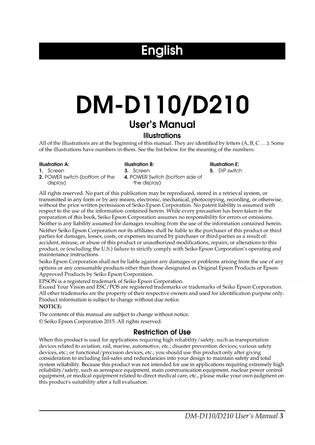 DM-D110 DM-D210DM-D110/D210 User’s Manual 3 English DM-D110/D210 User’s Manual Illustrations All of the illustrations are at the beginning of this manual. They are identified by letters (A, B, C ...). Some of the illustrations have numbers in them. See the list below for the meaning of the numbers. All rights reserved. No part of this publication may be reproduced, stored in a retrieval system, or transmitted in any form or by any means, electronic, mechanical, photocopying, recording, or otherwise, without the prior written permission of Seiko Epson Corporation. No patent liability is assumed with respect to the use of the information contained herein. While every precaution has been taken in the preparation of this book, Seiko Epson Corporation assumes no responsibility for errors or omissions. Neither is any liability assumed for damages resulting from the use of the information contained herein. Neither Seiko Epson Corporation nor its affiliates shall be liable to the purchaser of this product or third parties for damages, losses, costs, or expenses incurred by purchaser or third parties as a result of: accident, misuse, or abuse of this product or unauthorized modifications, repairs, or alterations to this product, or (excluding the U.S.) failure to strictly comply with Seiko Epson Corporation’s operating and maintenance instructions. Seiko Epson Corporation shall not be liable against any damages or problems arising from the use of any options or any consumable products other than those designated as Original Epson Products or Epson Approved Products by Seiko Epson Corporation. EPSON is a registered trademark of Seiko Epson Corporation. Exceed Your Vision and ESC/POS are registered trademarks or trademarks of Seiko Epson Corporation. All other trademarks are the property of their respective owners and used for identification purpose only. Product information is subject to change without due notice. NOTICE: The contents of this manual are subject to change without notice. © Seiko Epson Corporation 2015. All rights reserved. Restriction of Use When this product is used for applications requiring high reliability/safety, such as transportation devices related to aviation, rail, marine, automotive, etc.; disaster prevention devices; various safety devices, etc.; or functional/precision devices, etc.; you should use this product only after giving consideration to including fail-safes and redundancies into your design to maintain safety and total system reliability. Because this product was not intended for use in applications requiring extremely high reliability/safety, such as aerospace equipment, main communication equipment, nuclear power control equipment, or medical equipment related to direct medical care, etc., please make your own judgment on this product's suitability after a full evaluation. Illustration A: Illustration B: Illustration E: