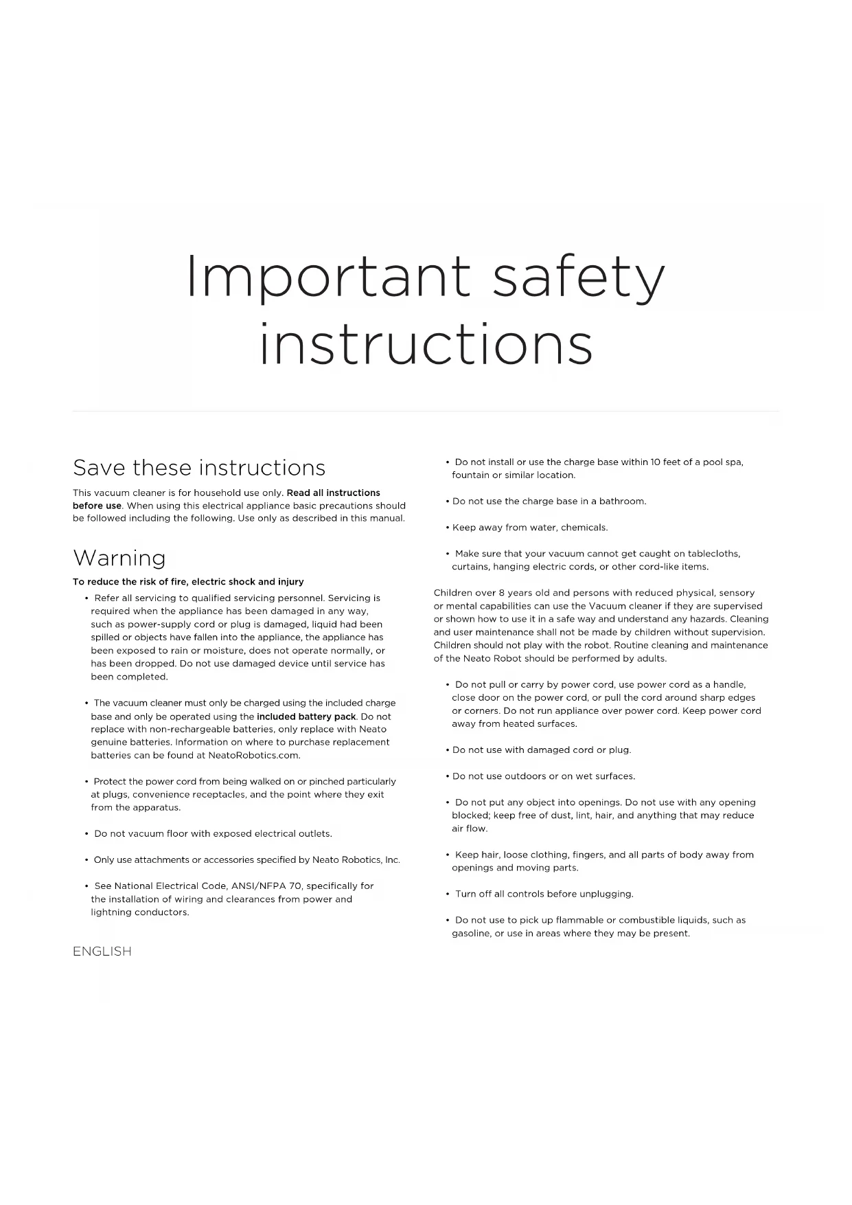 - Only use attachments or accessories specified by Neato Robotics, Inc.