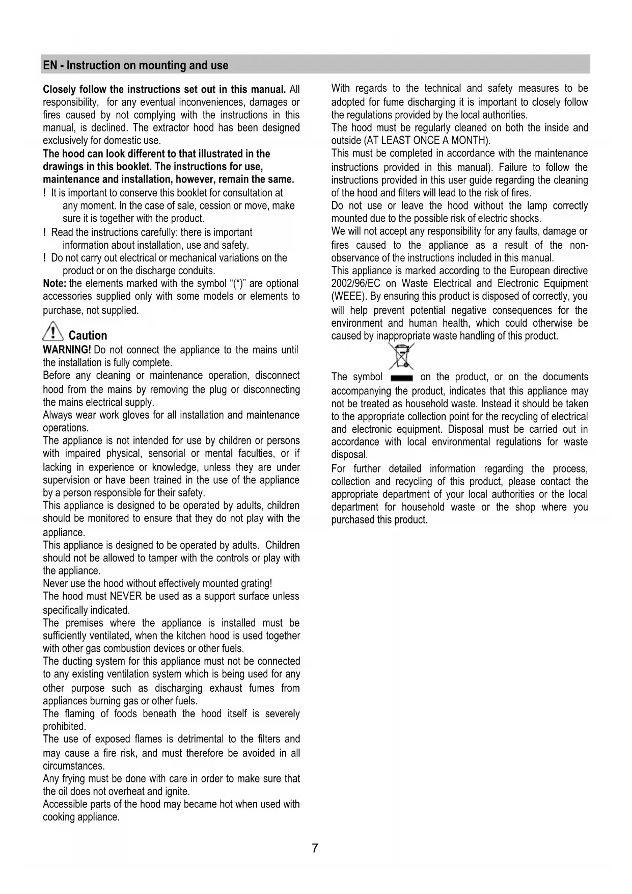 EN - Instruction on mounting and use Closely follow the instructions set out in this manual. All responsibility, for any eventual inconveniences, damages or fires caused by not complying with the instructions in this manual, is declined. The extractor hood has been designed exclusively for domestic use. The hood can look different to that illustrated in the drawings in this booklet. The instructions for use, maintenance and installation, however, remain the same. ! It is important to conserve this booklet for consultation at any moment. In the case of sale, cession or move, make sure it is together with the product. ! Read the instructions carefully: there is important information about installation, use and safety. ! Do not carry out electrical or mechanical variations on the product or on the discharge conduits. Note: the elements marked with the symbol “(*)” are optional accessories supplied only with some models or elements to purchase, not supplied. Caution WARNING! Do not connect the appliance to the mains until the installation is fully complete. Before any cleaning or maintenance operation, disconnect hood from the mains by removing the plug or disconnecting the mains electrical supply. Always wear work gloves for all installation and maintenance operations. The appliance is not intended for use by children or persons with impaired physical, sensorial or mental faculties, or if lacking in experience or knowledge, unless they are under supervision or have been trained in the use of the appliance by a person responsible for their safety. This appliance is designed to be operated by adults, children should be monitored to ensure that they do not play with the appliance. This appliance is designed to be operated by adults. Children should not be allowed to tamper with the controls or play with the appliance. Never use the hood without effectively mounted grating! The hood must NEVER be used as a support surface unless specifically indicated. The premises where the appliance is installed must be sufficiently ventilated, when the kitchen hood is used together with other gas combustion devices or other fuels. The ducting system for this appliance must not be connected to any existing ventilation system which is being used for any other purpose such as discharging exhaust fumes from appliances burning gas or other fuels. The flaming of foods beneath the hood itself is severely prohibited. The use of exposed flames is detrimental to the filters and may cause a fire risk, and must therefore be avoided in all circumstances. Any frying must be done with care in order to make sure that the oil does not overheat and ignite. Accessible parts of the hood may became hot when used with cooking appliance. With regards to the technical and safety measures to be adopted for fume discharging it is important to closely follow the regulations provided by the local authorities. The hood must be regularly cleaned on both the inside and outside (AT LEAST ONCE A MONTH). This must be completed in accordance with the maintenance instructions provided in this manual). Failure to follow the instructions provided in this user guide regarding the cleaning of the hood and filters will lead to the risk of fires. Do not use or leave the hood without the lamp correctly mounted due to the possible risk of electric shocks. We will not accept any responsibility for any faults, damage or fires caused to the appliance as a result of the non- observance of the instructions included in this manual. This appliance is marked according to the European directive 2002/96/EC on Waste Electrical and Electronic Equipment (WEEE). By ensuring this product is disposed of correctly, you will help prevent potential negative consequences for the environment and human health, which could otherwise be caused by inappropriate waste handling of this product. The symbol on the product, or on the documents accompanying the product, indicates that this appliance may not be treated as household waste. Instead it should be taken to the appropriate collection point for the recycling of electrical and electronic equipment. Disposal must be carried out in accordance with local environmental regulations for waste disposal. For further detailed information regarding the process, collection and recycling of this product, please contact the appropriate department of your local authorities or the local department for household waste or the shop where you purchased this product.8 Use The hood is designed to be used either for exhausting or filter version. Ducting version In this case the fumes are conveyed outside of the building by means of a special pipe connected with the connection ring located on top of the hood. Attention! The exhausting pipe is not supplied and must be purchased apart. Diameter of the exhausting pipe must be equal to that of the connection ring. In the horizontal runs the exhausting pipe must be slightly slanted (about 10°) and directed upwards to vent the air easily from the room to the outside. Attention! If the hood is supplied with active charcoal filter, then it must be removed. Connect the hood and discharge holes on the walls with a diameter equivalent to the air outlet (connection flange). Using the tubes and discharge holes on walls with smaller dimensions will cause a diminution of the suction performance and a drastic increase in noise. Any responsibility in the matter is therefore declined. ! Use a duct of the minimum indispensible length. ! Use a duct with as few elbows as possible (maximum elbow angle: 90°). ! Avoid drastic changes in the duct cross-section. ! Use a duct with an as smooth as possible inside. ! The duct must be made of certified material. Filter version One active charcoal filter is needed for this and can be obtained from your usual retailer. The filter removes the grease and smells from the extracted air before sending it back into the room through the upper outlet grid. Installation The minimu