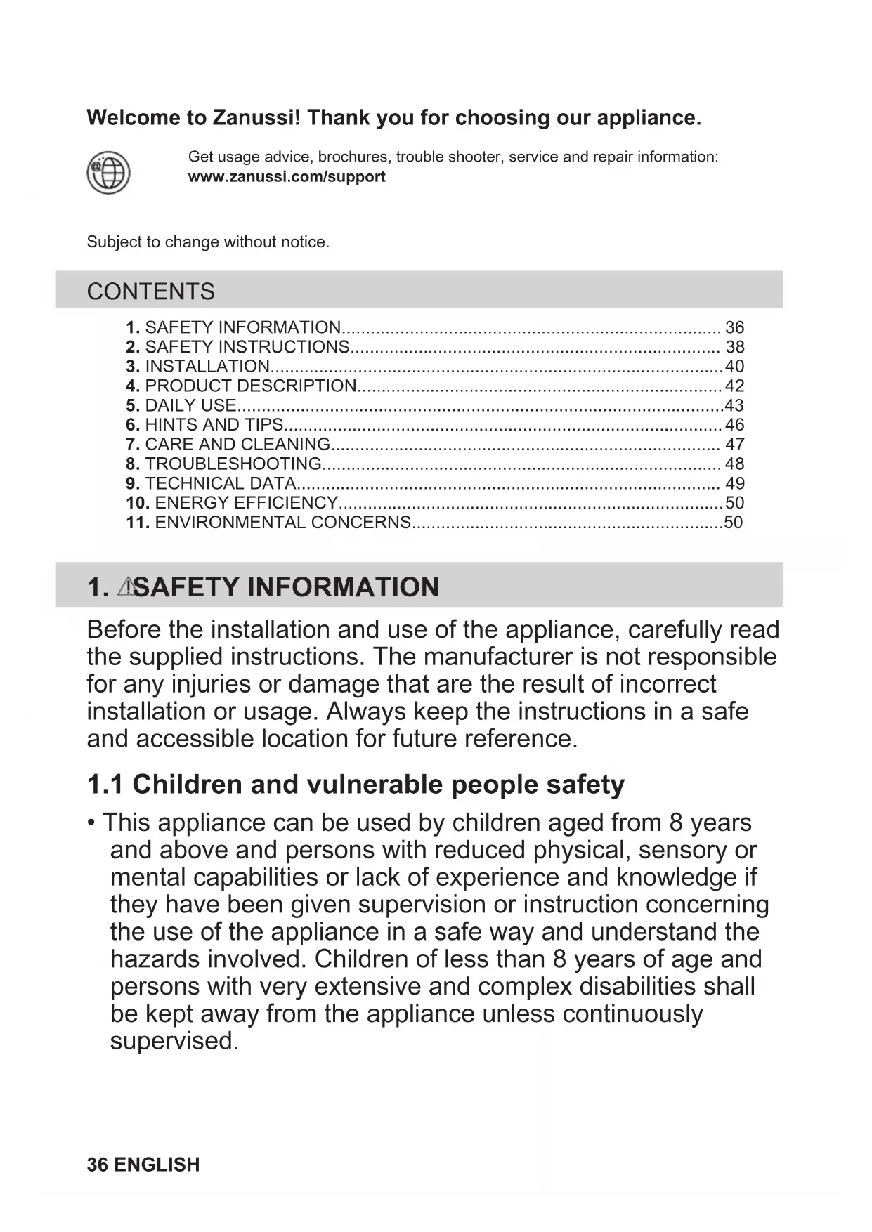 - This appliance can be used by children aged from 8 years and above and persons with reduced physical, sensory or mental capabilities or lack of experience and knowledge if they have been given supervision or instruction concerning the use of the appliance in a safe way and understand the hazards involved. Children of less than 8 years of age and persons with very extensive and complex disabilities shall be kept away from the appliance unless continuously supervised. 36 ENGLISH• Children should be supervised to ensure that they do not play with the appliance.