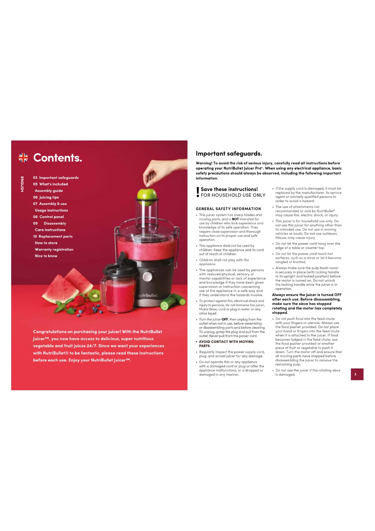 may cause fire, electric shock, or injury. • This juicer is for household use only. Do not use this juicer for anything other than its intended use. Do not use in moving vehicles or boats. Do not use outdoors. Misuse may cause injury.• Do not let the power cord hang over the edge of a table or counter top. • Do not let the power cord touch hot surfaces, such as a stove or let it become tangled or knotted.• Always make sure the pulp basin cover is securely in place (with locking handle in its upright and locked position) before the motor is turned on. Do not unlock the locking handle while the juicer is in operation.Always ensure the juicer is turned OFF after each use. Before disassembling, make sure the sieve has stopped rotating and the motor has completely stopped.• Do not push food into the feed chute with your fingers or utensils. Always use the food pusher provided. Do not place your hand or fingers into the feed chute when it is attached to the juicer. If food becomes lodged in the feed chute, use the food pusher provided or another piece of fruit or vegetable to push it down. Turn the motor o and ensure that all moving parts have stopped before disassembling the juicer to remove the remaining pulp.• Do not use the juicer if the rotating sieve is damaged. Contents. 03 Important safeguards05 What’s included Assembly guide06 Juicing tips07 Assembly & use Usage instructions08 Control panel09 Disassembly Care instructions10 Replacement parts How to store Warranty registration Nice to know Congratulations on purchasing your juicer! With the NutriBullet Juicer™, you now have access to delicious, super nutritious vegetable and fruit juices 24/7. Since we want your experiences with NutriBullet® to be fantastic, please read these instructions before each use. Enjoy your NutriBullet Juicer™. Important safeguards. Warning! To avoid the risk of serious injury, carefully read all instructions before operating your NutriBullet Juicer Pro . When using any electrical appliance, basic safety precautions should always be observed, including the following important information. !54
