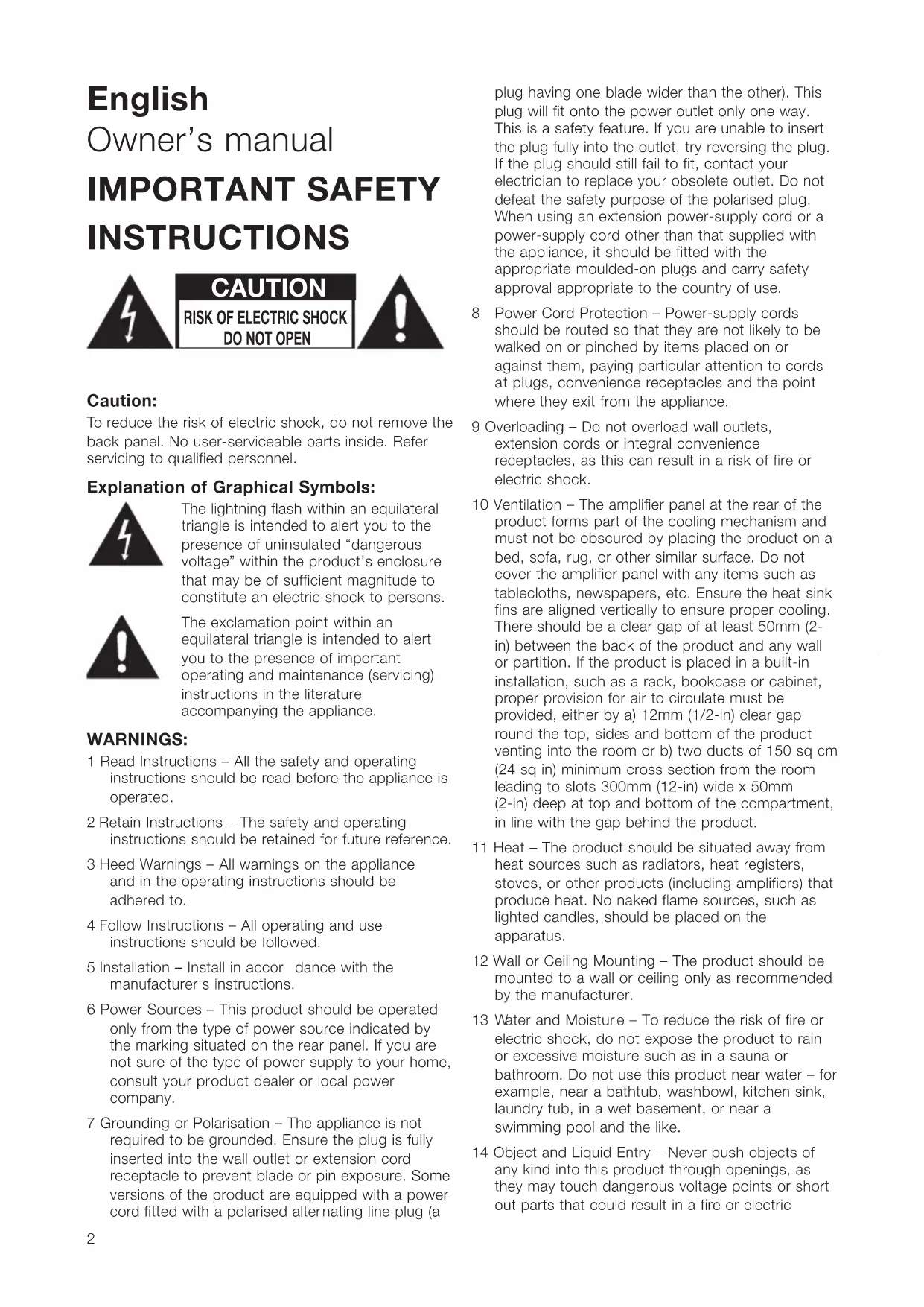 EU Declaration of Conformity..................86 Technical Specifications .......87–88 6489 ASW 825_855 inside.qxd 20/8/07 09:55 Page 1English Owner’s manual IMPORTANT SAFETY INSTRUCTIONS Caution: To reduce the risk of electric shock, do not remove the back panel. No user-serviceable parts inside. Refer servicing to qualified personnel. Explanation of Graphical Symbols: The lightning flash within an equilateral triangle is intended to alert you to the presence of uninsulated “dangerous voltage” within the product’s enclosure that may be of sufficient magnitude to constitute an electric shock to persons. The exclamation point within an equilateral triangle is intended to alert you to the presence of important operating and maintenance (servicing) instructions in the literature accompanying the appliance. WARNINGS: 1 Read Instructions – All the safety and operating instructions should be read before the appliance is operated. 2 Retain Instructions – The safety and operating instructions should be retained for future reference. 3 Heed Warnings – All warnings on the appliance and in the operating instructions should be adhered to. 4 Follow Instructions – All operating and use instructions should be followed. 5 Installation – Install in accor dance with the manufacturer's instructions. 6 Power Sources – This product should be operated only from the type of power source indicated by the marking situated on the rear panel. If you are not sure of the type of power supply to your home, consult your pr oduct dealer or local power company. 7 Grounding or Polarisation – The appliance is not required to be grounded. Ensure the plug is fully inserted into the wall outlet or extension cor