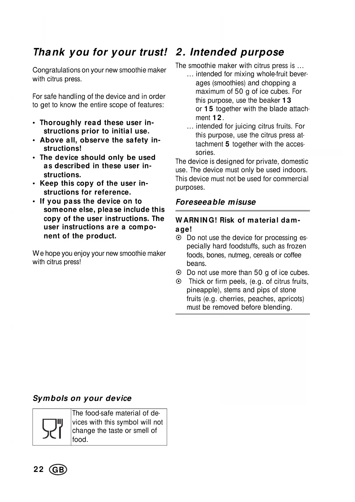 The smoothie maker with citrus press is … … intended for mixing whole-fruit bever- ages (smoothies) and chopping a maximum of 50 g of ice cubes. For this purpose, use the beaker|13 or|15 together with the blade attach- ment|12. … intended for juicing citrus fruits. For this purpose, use the citrus press at- tachment|5 together with the acces- sories. The device is designed for private, domestic use. The device must only be used indoors. This device must not be used for commercial purposes. Foreseeable misuse WARNING! Risk of material dam- age!