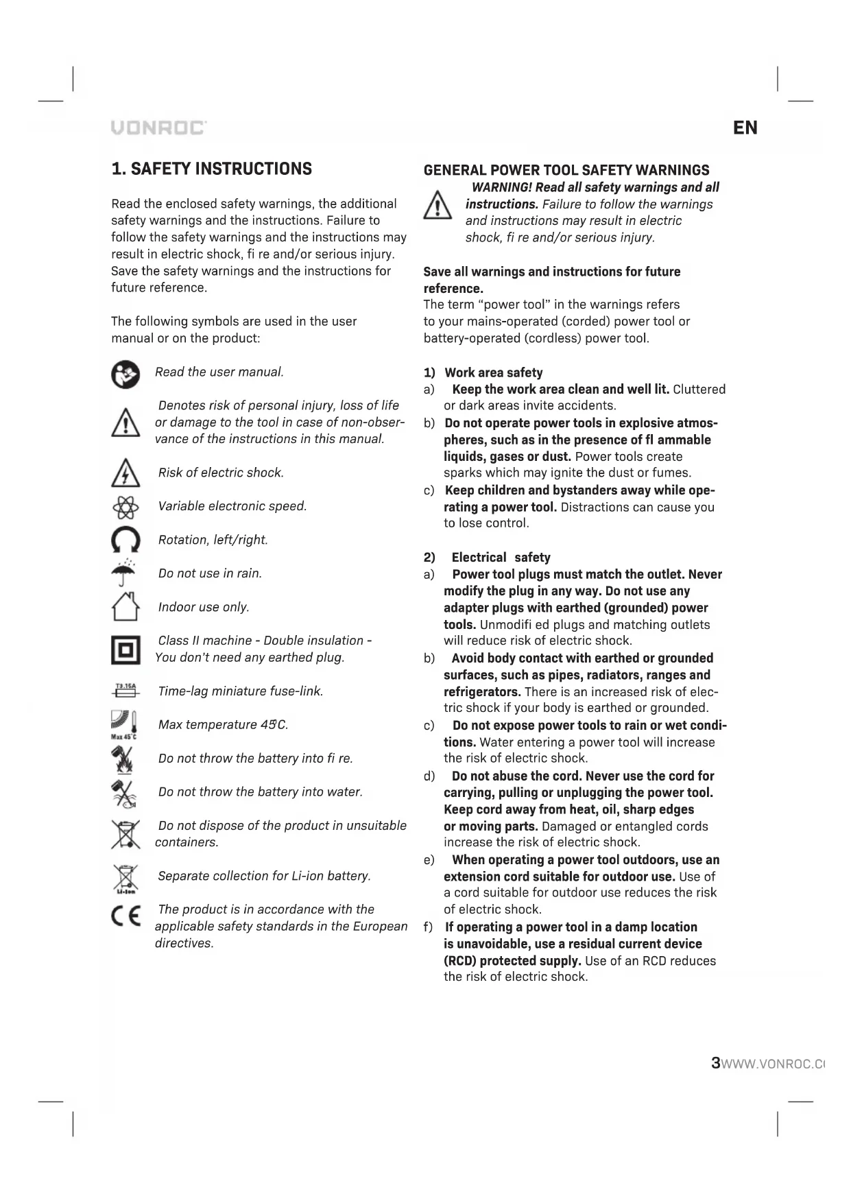 ENVIRONMENT Faulty and/or discarded electrical or electronic apparatus have to be collected at the appropriate recycling locations. Only for EC countries Do not dispose of power tools into domestic waste. According to the European Guideline 2012/19/EC for Waste Electrical and Electronic Equipment and its implementation into national right, power tools that are no longer usable must be collected separately and disposed of in an environmentally friendly way. WARRANTY VONROC products are developed to the highest quality standards and are guaranteed free of defects in both materials and workmanship for the period lawfully stipulated starting from the date of original purchase. Should the product develop any failure du- ring this period due to defective material and/or work- manship then contact VONROC directly. The following circumstances are excluded from this guarantee: