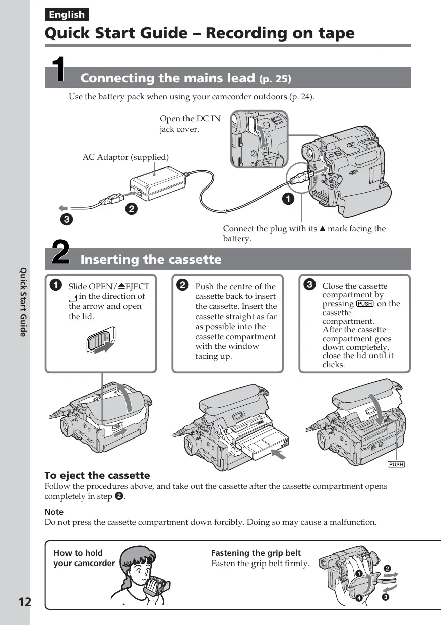 Suivez les procédures ci-dessus et sortez la cassette après la complète ouverture du logement de cassette à l’étape 2. Remarque Ne refermez pas le logement de cassette de force en appuyant dessus. Ceci pourrait entraîner un problème de fonctionnement. Comment tenir votre caméscope
