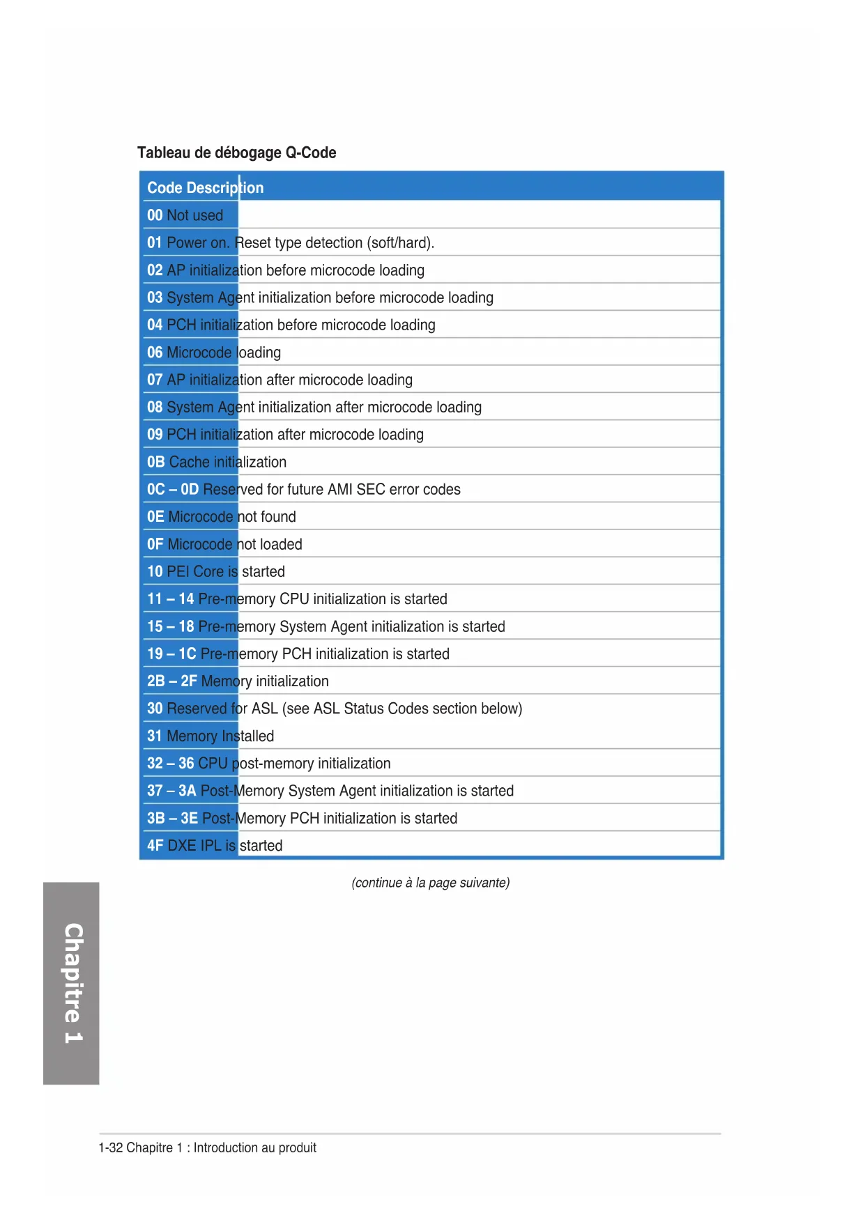 (continue à la page suivante) Code Description F9 Recovery capsule is not found FA Invalid recovery capsule FB – FF Reserved for future AMI error codes 60 DXE Core is started 61 NVRAM initialization 62 Installation of the PCH Runtime Services 63 – 67 CPU DXE initialization is started 68 PCI host bridge initialization 69 System Agent DXE initialization is started 6A System Agent DXE SMM initialization is started 6B – 6F System Agent DXE initialization (System Agent module specic) 70 PCH DXE initialization is started 71 PCH DXE SMM initialization is started 72 PCH devices initialization 73 – 77 PCH DXE Initialization (PCH module specic) 78 ACPI module initialization 79 CSM initialization 7A – 7F Reserved for future AMI DXE codes 90 Boot Device Selection (BDS) phase is started 91 Driver connecting is started 92 PCI Bus initialization is started 93 PCI Bus Hot Plug Controller Initialization 94 PCI Bus Enumeration 95 PCI Bus Request Resources 96 PCI Bus Assign Resources 97 Console Output devices connect 98 Console input devices connect 99 Super IO Initialization 9A USB initialization is started 9B USB Reset1-36 Chapitre 1 : Introduction au produit