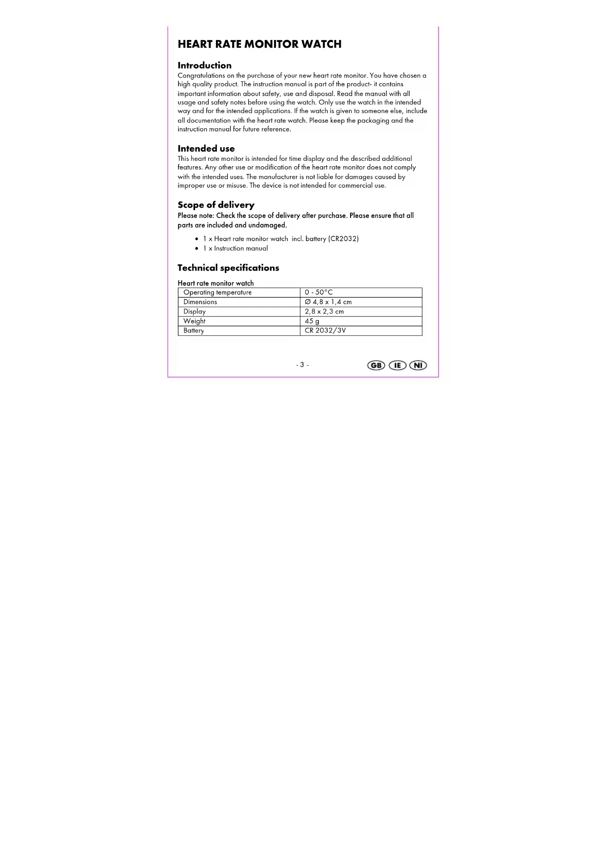 Introduction Congratulations on the purchase of your new heart rate monitor. You have chosen a high quality product. The instruction manual is part of the product- it contains important information about safety, use and disposal. Read the manual with all usage and safety notes before using the watch. Only use the watch in the intended way and for the intended applications. If the watch is given to someone else, include all documentation with the heart rate watch. Please keep the packaging and the instruction manual for future reference. Intended use This heart rate monitor is intended for time display and the described additional features. Any other use or modification of the heart rate monitor does not comply with the intended uses. The manufacturer is not liable for damages caused by improper use or misuse. The device is not intended for commercial use. Scope of delivery Please note: Check the scope of delivery after purchase. Please ensure that all parts are included and undamaged. 1 x Heart rate monitor watch incl. battery (CR2032) 1 x Instruction manual Technical specifications Heart rate monitor watch Operating temperature