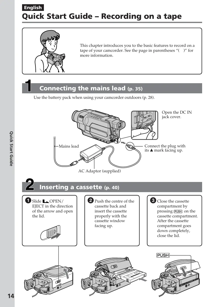 Quick Start Guide – Recording on a tape 14 – Recording on a “Memory Stick” 16
