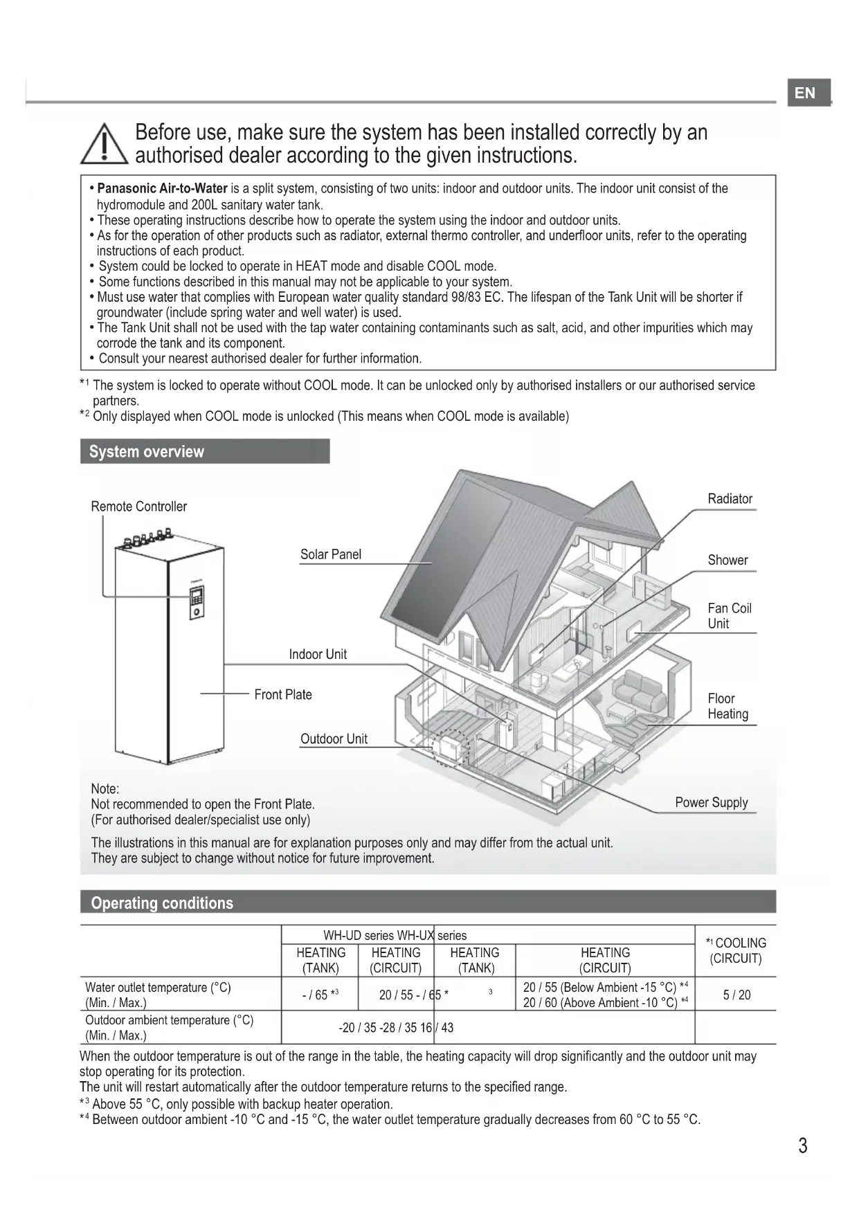 COOLING(CIRCUIT)HEATING (TANK)HEATING (CIRCUIT)HEATING (TANK)HEATING (CIRCUIT)Water outlet temperature (°C) (Min. / Max.)- / 65 * 20 / 55 - / 65 * 20 / 55 (Below Ambient -15 °C) * 20 / 60 (Above Ambient -10 °C) * 5 / 20Outdoor ambient temperature (°C)(Min. / Max.)-20 / 35 -28 / 35 16 / 43 When the outdoor temperature is out of the range in the table, the heating capacity will drop signifi cantly and the outdoor unit may stop operating for its protection. The unit will restart automatically after the outdoor temperature returns to the specifi ed range.