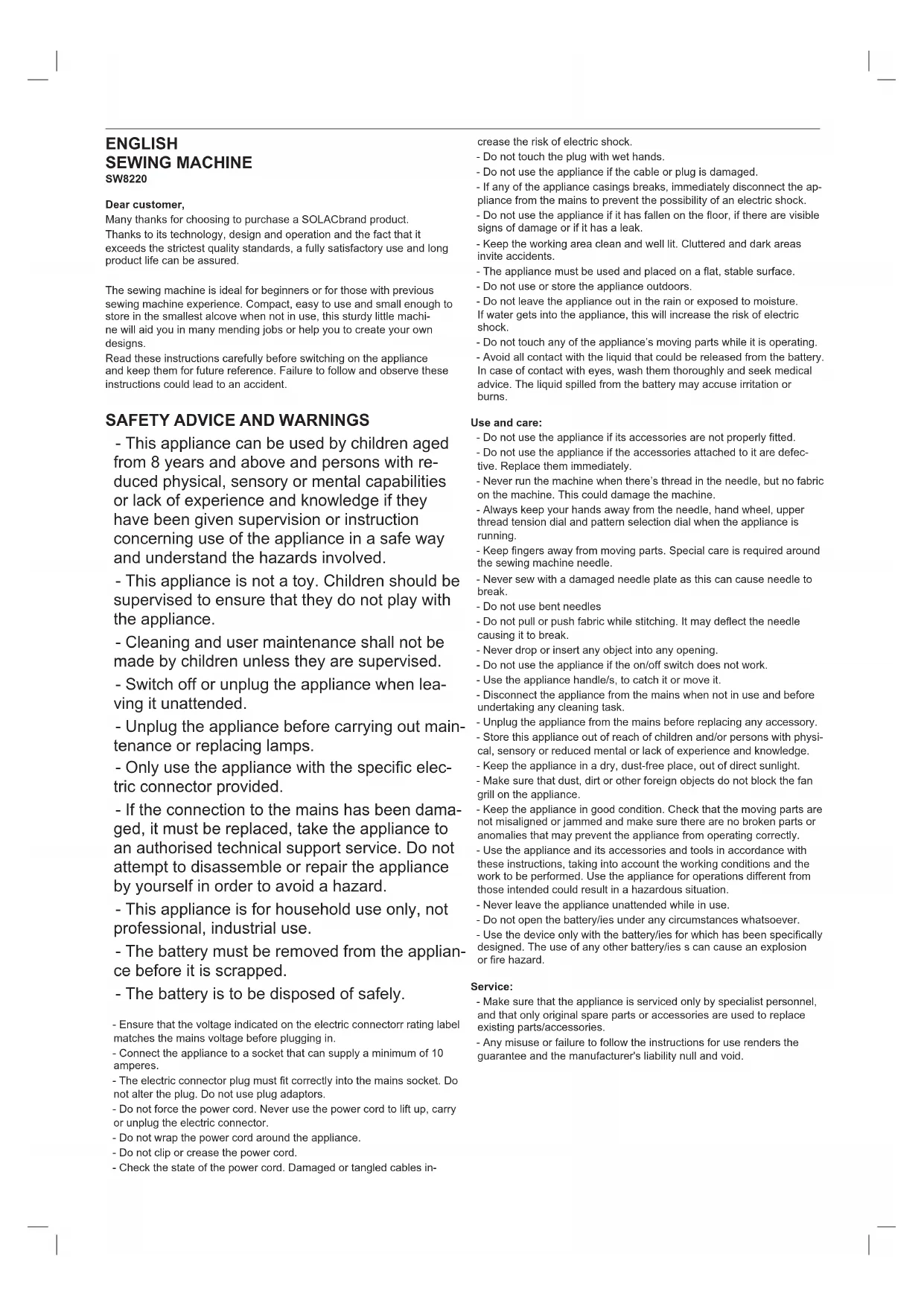 SEWING MACHINE SW8220 Dear customer, Many thanks for choosing to purchase a SOLACbrand product. Thanks to its technology, design and operation and the fact that it exceeds the strictest quality standards, a fully satisfactory use and long product life can be assured. The sewing machine is ideal for beginners or for those with previous sewing machine experience. Compact, easy to use and small enough to store in the smallest alcove when not in use, this sturdy little machi- ne will aid you in many mending jobs or help you to create your own designs. Read these instructions carefully before switching on the appliance and keep them for future reference. Failure to follow and observe these instructions could lead to an accident.