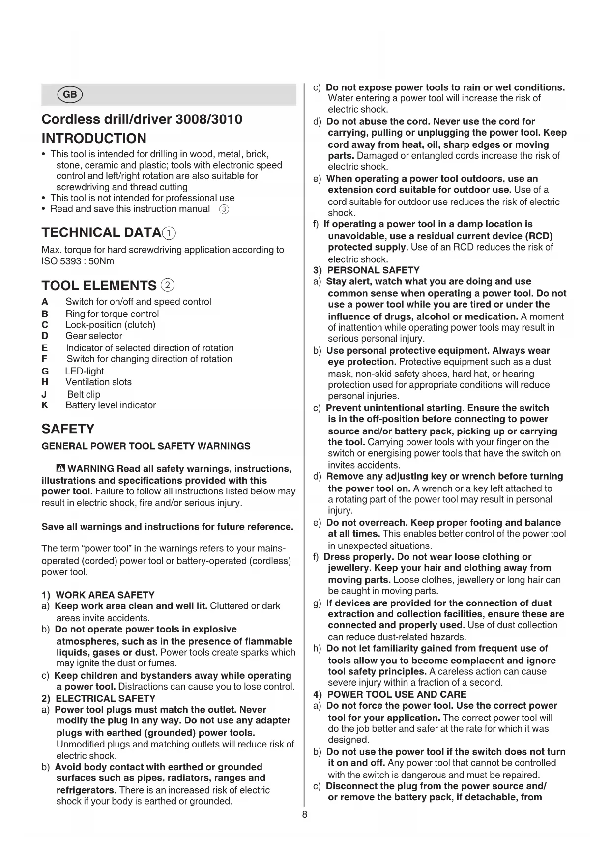 A Switch for on/o and speed control B Ring for torque control C Lock-position (clutch) D Gear selector E Indicator of selected direction of rotation F Switch for changing direction of rotation G LED-light H Ventilation slots J Belt clip K Battery level indicator SAFETY