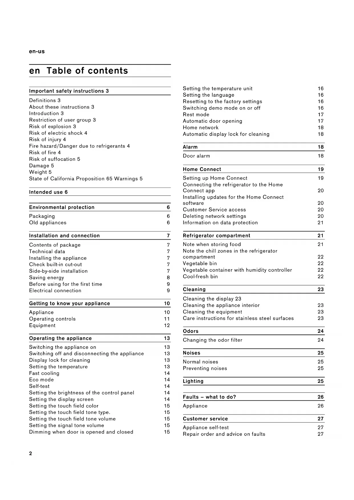 - es Instrucciones de uso RC462705 RC472705 RC492705 Refrigerator Réfrigérateur Frigorífico2 en-us en Table of contents en Instruction manual Important safety instructions 3 Definitions 3 About these instructions 3 Introduction 3 Restriction of user group 3 Risk of explosion 3 Risk of electric shock 4 Risk of injury 4 Fire hazard/Danger due to refrigerants 4 Risk of fire 4 Risk of suffocation 5 Damage 5 Weight 5 State of California Proposition 65 Warnings 5 Intended use 6 Environmental protection 6 Packaging 6 Old appliances 6 Installation and connection 7 Contents of package 7 Technical data 7 Installing the appliance 7 Check built-in cut-out 7 Side-by-side installation 7 Saving energy 8 Before using for the first time 9 Electrical connection 9 Getting to know your appliance 10 Appliance 10 Operating controls 11 Equipment 12 Operating the appliance 13 Switching the appliance on 13 Switching off and disconnecting the appliance 13 Display lock for cleaning 13 Setting the temperature 13 Fast cooling 14 Eco mode 14 Self-test 14 Setting the brightness of the control panel 14 Setting the display screen 14 Setting the touch field color 15 Setting the touch field tone type. 15 Setting the touch field tone volume 15 Setting the signal tone volume 15 Dimming when door is opened and closed 15 Setting the temperature unit 16 Setting the language 16 Resetting to the factory settings 16 Switching demo mode on or off 16 Rest mode 17 Automatic door opening 17 Home network 18 Automatic display lock for cleaning 18 Alarm 18 Door alarm 18 Home Connect 19 Setting up Home Connect 19 Connecting the refrigerator to the Home Connect app 20 Installing updates for the Home Connect software 20 Customer Service access 20 Deleting network settings 20 Information on data protection 21 Refrigerator compartment 21 Note when storing food 21 Note the chill zones in the refrigerator compartment 22 Vegetable bin 22 Vegetable container with humidity controller 22 Cool-fresh bin 22 Cleaning 23 Cleaning the display 23 Cleaning the appliance interior 23 Cleaning the equipment 23 Care instructions for stainless steel surfaces 23 Odors 24 Changing the odor filter 24 Noises 25 Normal noises 25 Preventing noises 25 Lighting 25 Faults – what to do? 26 Appliance 26 Customer service 27 Appliance self-test 27 Repair order and advice on faults 273 9 Important safety instructions READ INSTRUCTIONS - DO NOT DISCARD! p. 55