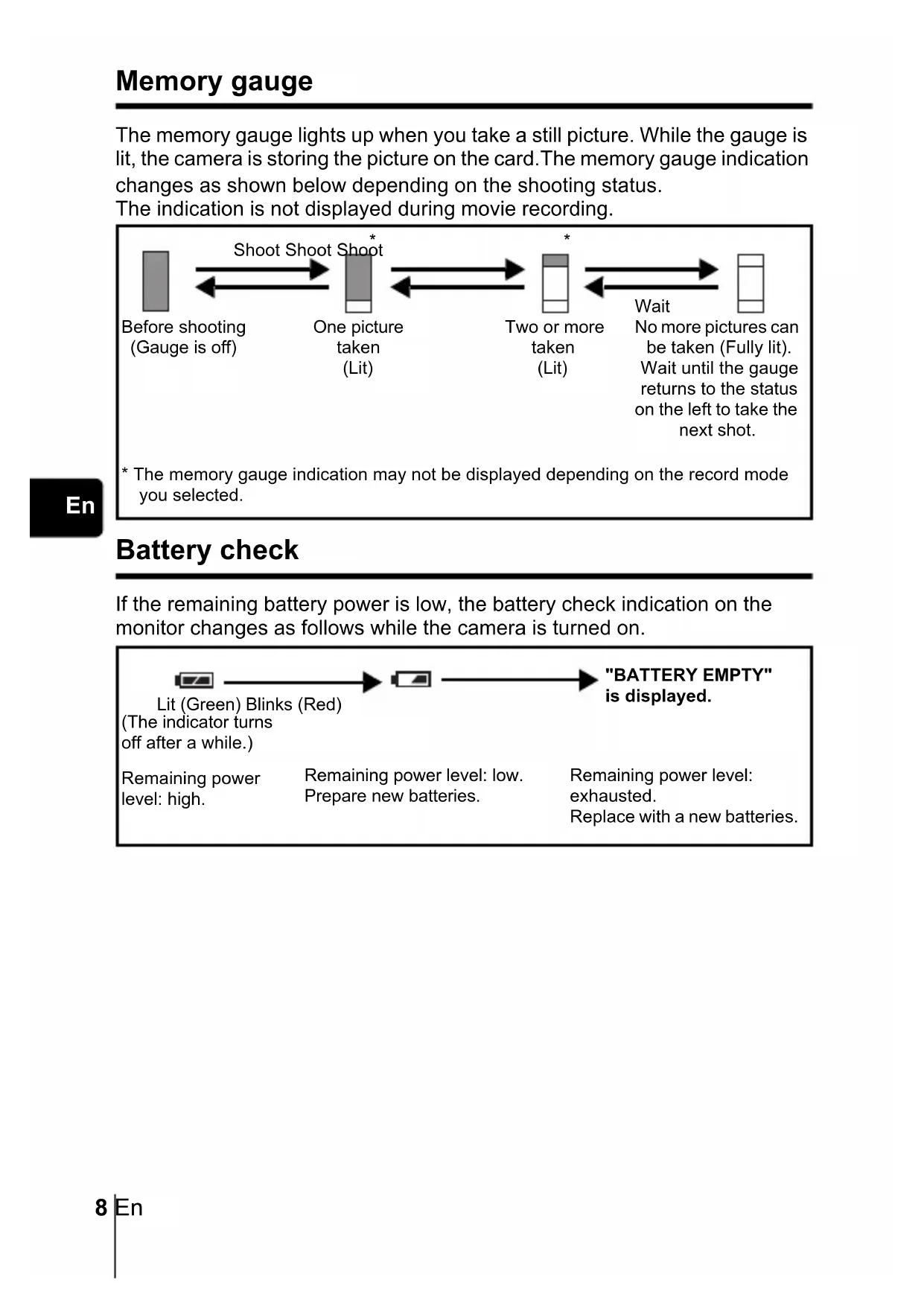 Memory gauge The memory gauge lights up when you take a still picture. While the gauge is lit, the camera is storing the picture on the card.The memory gauge indication changes as shown below depending on the shooting status. The indication is not displayed during movie recording. Battery check If the remaining battery power is low, the battery check indication on the monitor changes as follows while the camera is turned on. Before shooting (Gauge is off) No more pictures can be taken (Fully lit). Wait until the gauge returns to the status on the left to take the next shot. One picture taken (Lit) Two or more taken (Lit) Shoot Shoot Shoot Wait