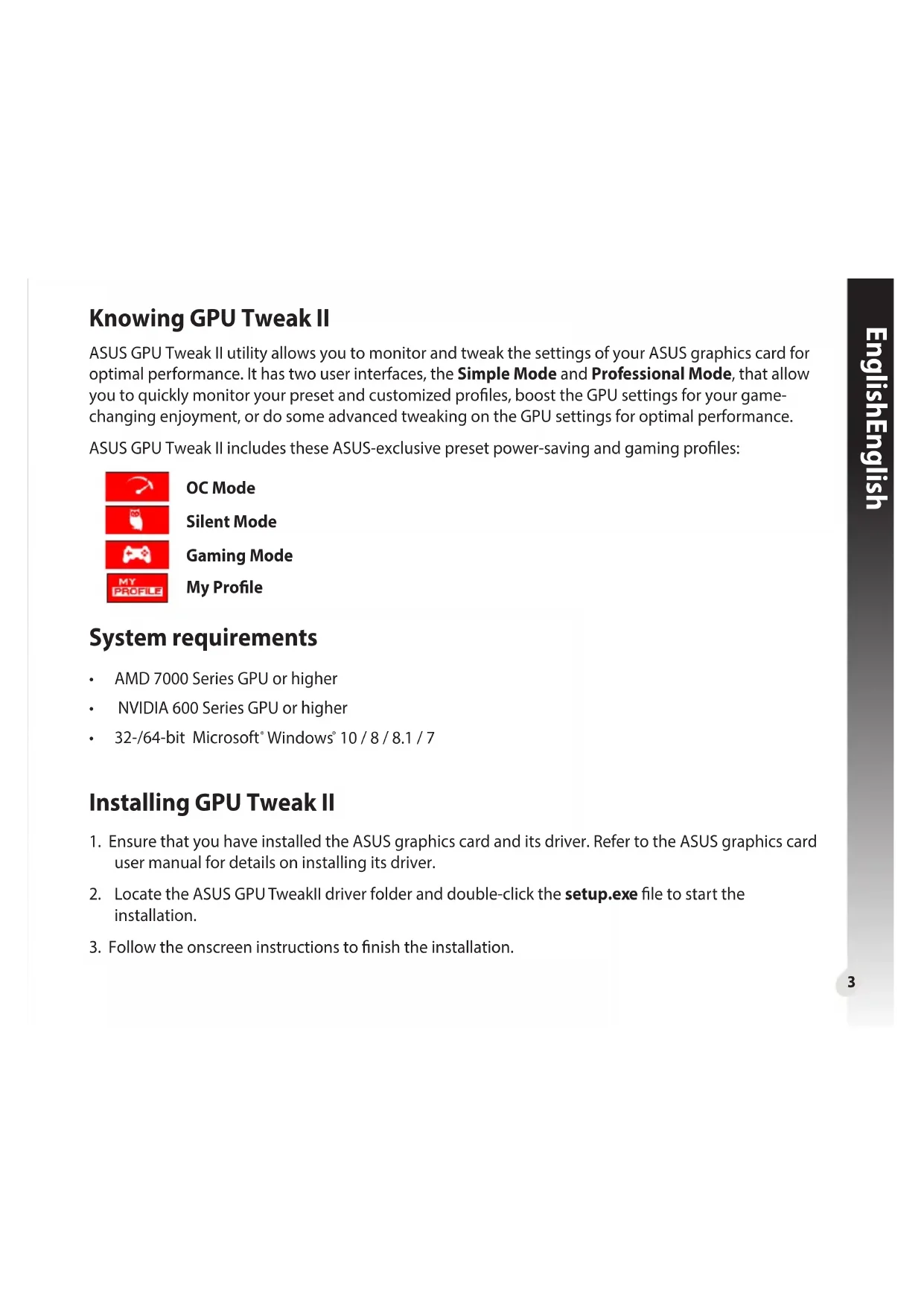 - Selecttheprole,thenclick to delete the prole.8 English English Getting the VGA info and Live Update TheInfoscreenprovidesyouwithinformationandliveupdatesaboutyourASUSVGAcard. NOTE: Ensure that your computer is connected to the Internet to get the Live Update.9 English English Launching XSplit Install and launch XSplit Gamecaster from GPU Tweak II.10 English English Using the Settings screen The Settings screen allows you to congure the GPU Tweak II settings such as Main, Tuning Settings, Live Update, and Keyboard Shortcuts. Main FromtheMainsettings,youcanselectanyoftheseoptionsonlaunchingGPUTweakII: