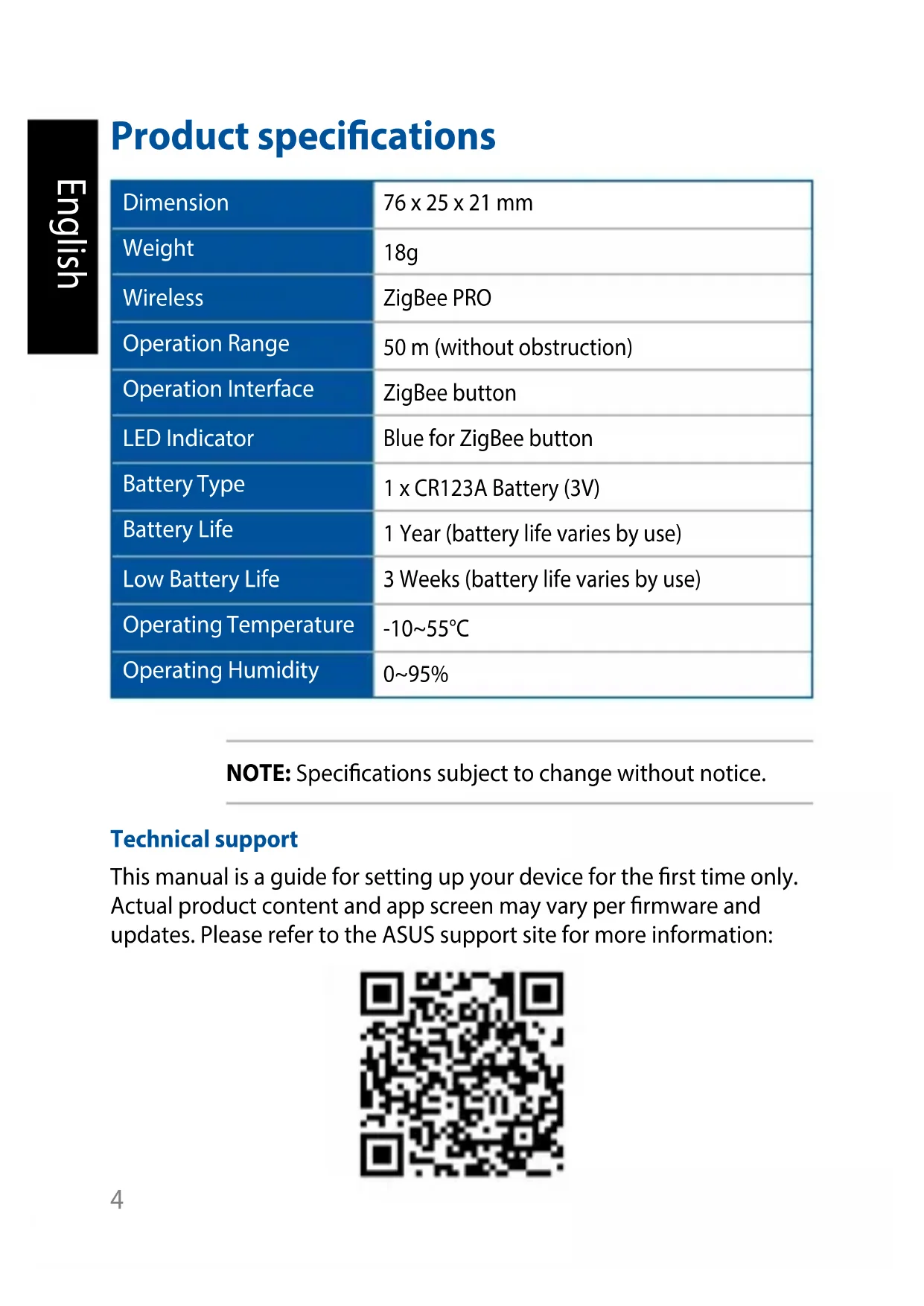 ........................................................................................100Product specications Dimension 76 x 25 x 21 mm Weight 18g Wireless ZigBee PRO Operation Range 50 m (without obstruction) Operation Interface ZigBee button LED Indicator Blue for ZigBee button Battery Type 1 x CR123A Battery (3V) Battery Life 1 Year (battery life varies by use) Low Battery Life 3 Weeks (battery life varies by use) Operating Temperature -10~55°C Operating Humidity 0~95% NOTE: Specications subject to change without notice. Technical support This manual is a guide for setting up your device for the rst time only. Actual product content and app screen may vary per rmware and updates. Please refer to the ASUS support site for more information: