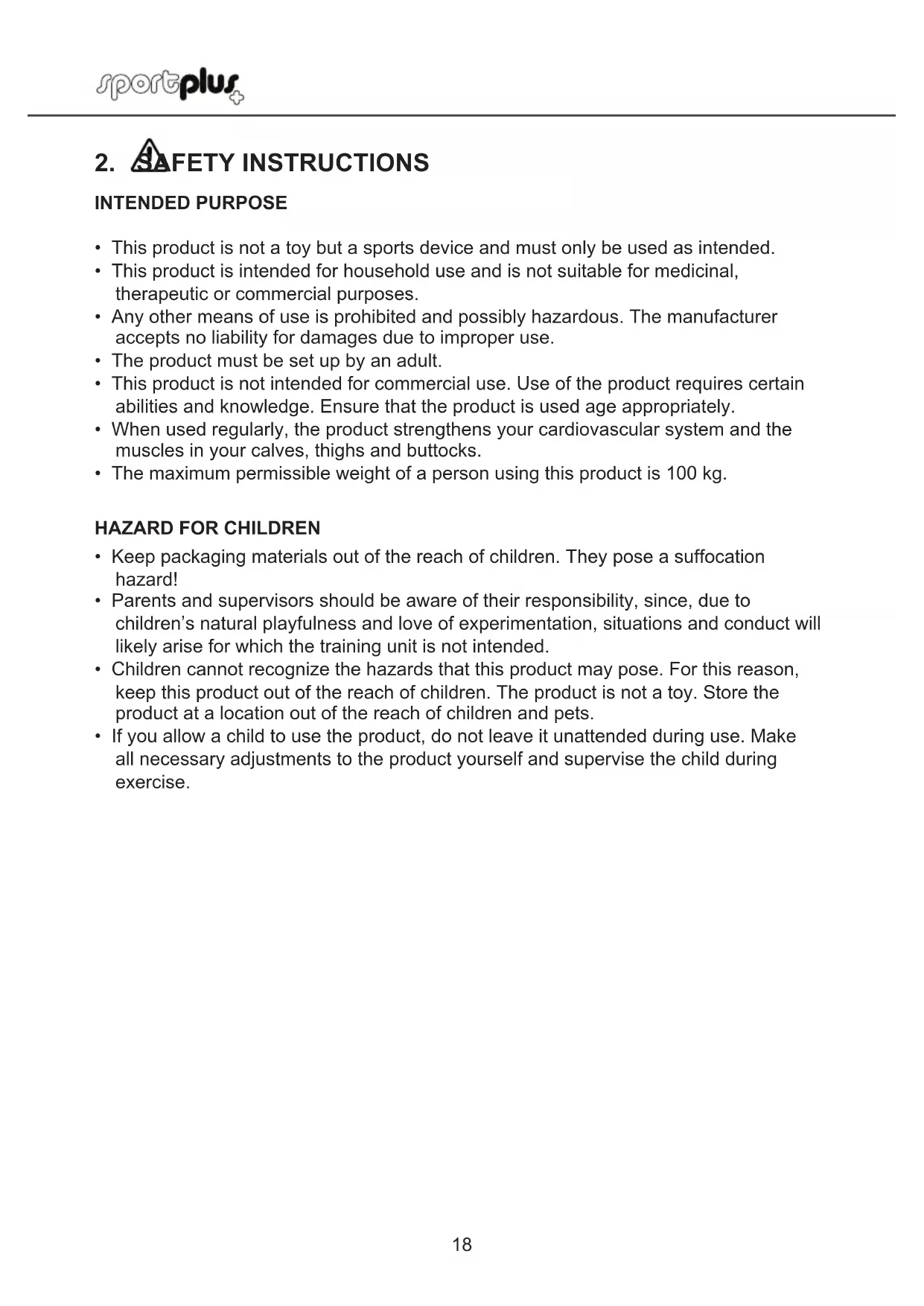 SportPlus guarantees that the product this warranty applies to was manufactured using high-quality materials and has been inspected with the utmost attention. The operation and assembly of the product according to the user manual is a precondition of this warranty. The warranty can be voided due to improper use and/or improper transport of the product. The warranty period is 2 years beginning on the date of purchase. If the product you have purchased is defective, please contact our service team within 24 months from the date of purchase. Excluded from the warranty are: