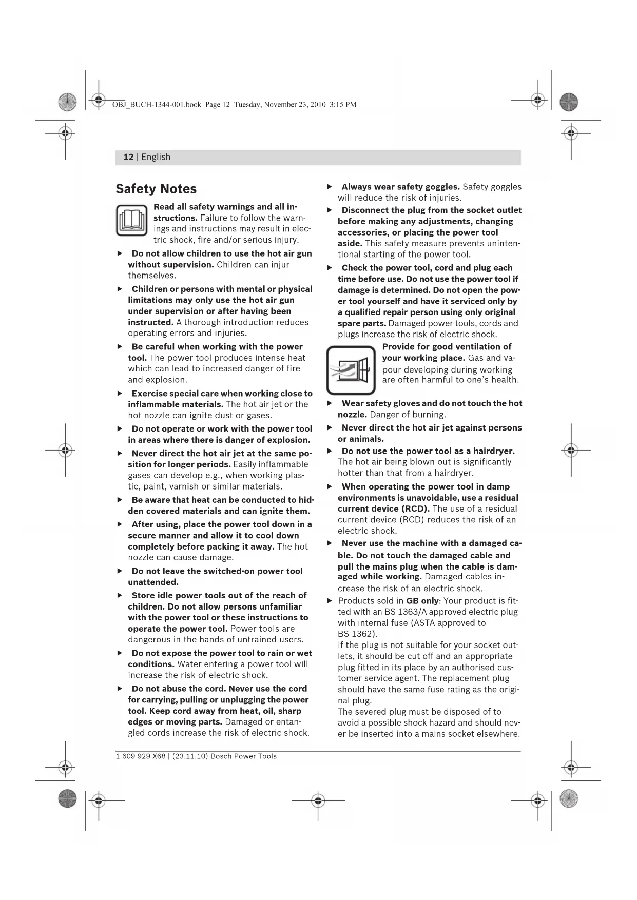 Safety Notes Read all safety warnings and all in- structions. Failure to follow the warn- ings and instructions may result in elec- tric shock, fire and/or serious injury. f Do not allow children to use the hot air gun without supervision. Children can injur themselves. f Children or persons with mental or physical limitations may only use the hot air gun under supervision or after having been instructed. A thorough introduction reduces operating errors and injuries. f Be careful when working with the power tool. The power tool produces intense heat which can lead to increased danger of fire and explosion. f Exercise special care when working close to inflammable materials. The hot air jet or the hot nozzle can ignite dust or gases. f Do not operate or work with the power tool in areas where there is danger of explosion. f Never direct the hot air jet at the same po- sition for longer periods. Easily inflammable gases can develop e.g., when working plas- tic, paint, varnish or similar materials. f Be aware that heat can be conducted to hid- den covered materials and can ignite them. f After using, place the power tool down in a secure manner and allow it to cool down completely before packing it away. The hot nozzle can cause damage. f Do not leave the switched-on power tool unattended. f Store idle power tools out of the reach of children. Do not allow persons unfamiliar with the power tool or these instructions to operate the power tool. Power tools are dangerous in the hands of untrained users. f Do not expose the power tool to rain or wet conditions. Water entering a power tool will increase the risk of electric shock. f Do not abuse the cord. Never use the cord for carrying, pulling or unplugging the power tool. Keep cord away from heat, oil, sharp edges or moving parts. Damaged or entan- gled cords increase the risk of electric shock. f Always wear safety goggles. Safety goggles will reduce the risk of injuries. f Disconnect the plug from the socket outlet before making any adjustments, changing accessories, or placing the power tool aside. This safety measure prevents uninten- tional starting of the power tool. f Check the power tool, cord and plug each time before use. Do not use the power tool if damage is determined. Do not open the pow- er tool yourself and have it serviced only by a qualified repair person using only original spare parts. Damaged power tools, cords and plugs increase the risk of electric shock. Provide for good ventilation of your working place. Gas and va- pour developing during working are often harmful to one’s health. f Wear safety gloves and do not touch the hot nozzle. Danger of burning. f Never direct the hot air jet against persons or animals. f Do not use the power tool as a hairdryer. The hot air being blown out is significantly hotter than that from a hairdryer. f When operating the power tool in damp environments is unavoidable, use a residual current device (RCD). The use of a residual current device (RCD) reduces the risk of an electric shock. f Never use the machine with a damaged ca- ble. Do not touch the damaged cable and pull the mains plug when the cable is dam- aged while working. Damaged cables in- crease the risk of an electric shock. f Products sold in GB only: Your product is fit- ted with an BS 1363/A approved electric plug with internal fuse (ASTA approved to BS 1362). If the plug is not suitable for your socket out- lets, it should be cut off and an appropriate plug fitted in its place by an authorised cus- tomer service agent. The replacement plug should have the same fuse rating as the origi- nal plug. The severed plug must be disposed of to avoid a possible shock hazard and should nev- er be inserted into a mains socket elsewhere. OBJ_BUCH-1344-001.book Page 12 Tuesday, November 23, 2010 3:15 PMEnglish | 13 Bosch Power Tools 1 609 929 X68 | (23.11.10) Functional Description While reading the operating instructions, unfold the graphics page for the machine and leave it open. Intended Use The power tool is intended for the forming and welding of plastic, removal of paint and the warming of heat-shrinkable tubing. It is also suitable for soldering and tinning, loosening of adhesive joints and the defrosting of water lines. Product Features The numbering of the product features refers to the illustration of the machine on the graphics page. 1 Nozzle 2 Heat protection collar 3 Standing surface 4 On-/Off switch with air-volume regulator and temperature control (GHG 500-2/GHG 600-3) 5 On/Off switch with air-volume regulator (GHG 630 DCE) 6 Button for temperature control (GHG 630 DCE) 7 Display (GHG 630 DCE) 8 Wide jet nozzle* 9 Glass protection nozzle* 10 Reflector nozzle* 11 Welding rod* 12 Welding shoe* 13 Reduction nozzle* 14 Heat-shrinkable sleeve* 15 Angle nozzle* *Accessories shown or described are not part of the standard delivery scope of the product. A complete overview of accessories can be found in our acces- sories program. Noise Information Measured sound values determined according to EN 60745. Typically the A-weighted sound pressure level of the product is lower than 70 dB(A). Technical Data Hot Air Gun GHG ... Professional