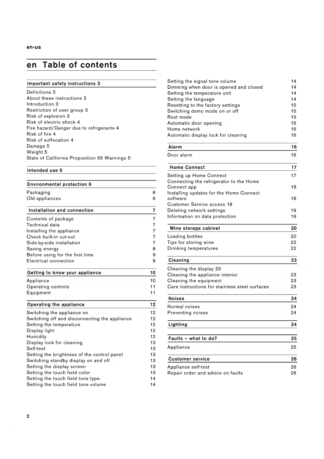 To then reconnect the appliance to the home WLAN network (Wi-Fi), perform initial setup again. ~ "Setting up the connection to the home network" on page 17 Information on data protection The first time your Home Connect appliance is registered on a WLAN home network connected to the Internet (Wi- Fi), your appliance will transmit the following types of data to the Home Connect server (initial registration): ▯ Unique appliance identification (consisting of appliance codes as well as the MAC address of the installed Wi-Fi communication module). ▯ Security certificate of the Wi-Fi communication module (to ensure a secure data connection). ▯ The current software and hardware version of your domestic appliance. ▯ Status of any previous resetting to factory settings. This initial registration prepares the Home Connect functions for use and is only required when you want to use these Home Connect functions for the first time. Note: Please note that the Home Connect functions can be utilized only in conjunction with the Home Connect app. Information on data protection can be called up in the Home Connect app.20 en-us Wine storage cabinet