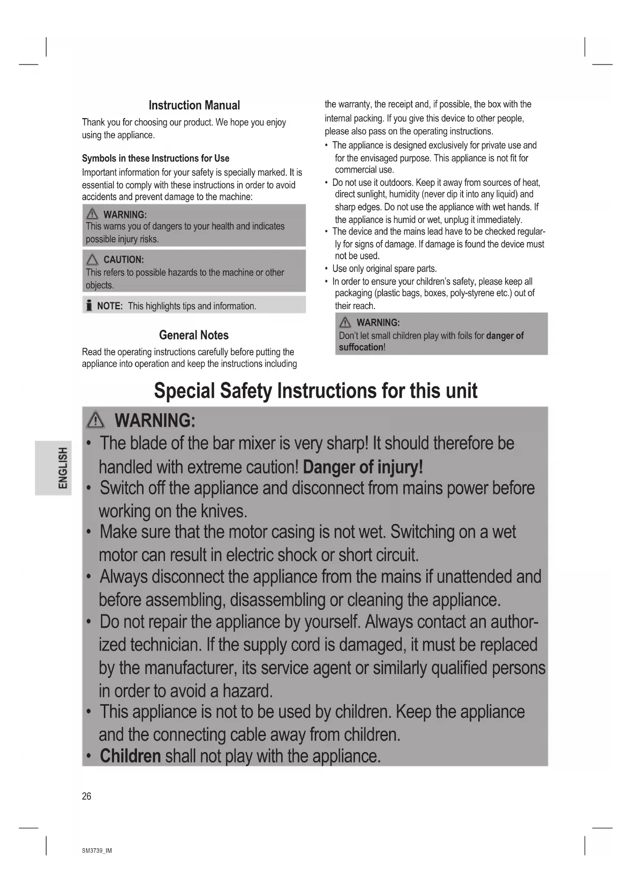 - If you want to clean the hand blender (mixing rod) thor- oughly, detach it from the motor housing as described under “Assembly / Dismantling”.29 SM3739_IM 14.03.19 Cleaning In Sudsy Water You can briey rinse the blender in warm sudsy water. After- wards rinse in clean water. Dry the blender thoroughly. Storage