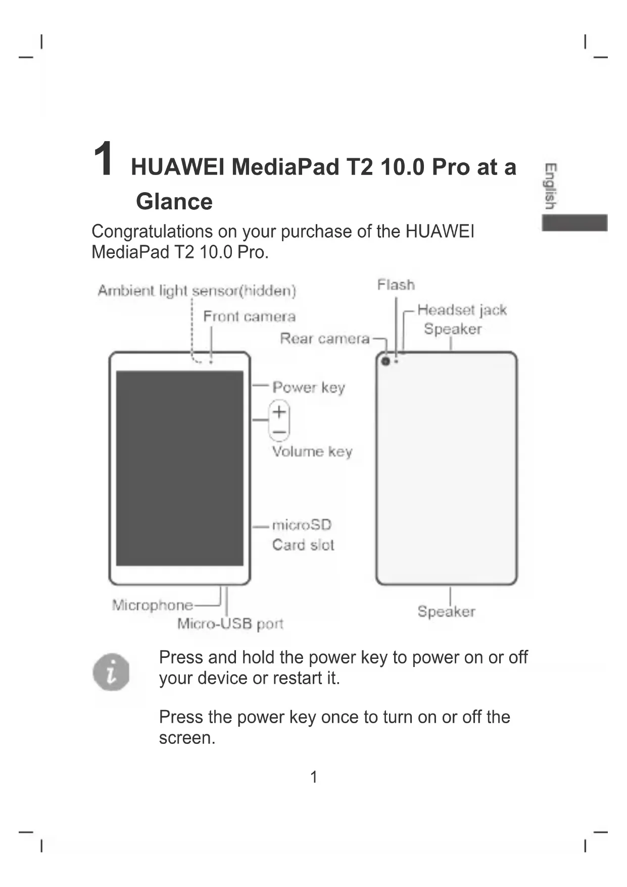 Español ............................................................. 1351 1 HUAWEI MediaPad T2 10.0 Pro at a Glance Congratulations on your purchase of the HUAWEI MediaPad T2 10.0 Pro. Press and hold the power key to power on or off your device or restart it. Press the power key once to turn on or off the screen.2 Avoid blocking the ambient light sensor, as this may affect some of the features on the T2 10.0 Pro. Choose a screen protect or that has a hole above the ambient light sensor. 2 Installation3 3 Charging the Battery4 4 Safety information This section contains important information about how to use your device safely and how it operates. Read this information carefully before using your device. Electronic device Do not use your device if its use is prohibited or if it may cause danger or interference with other electronic devices. Interference with medical equipment