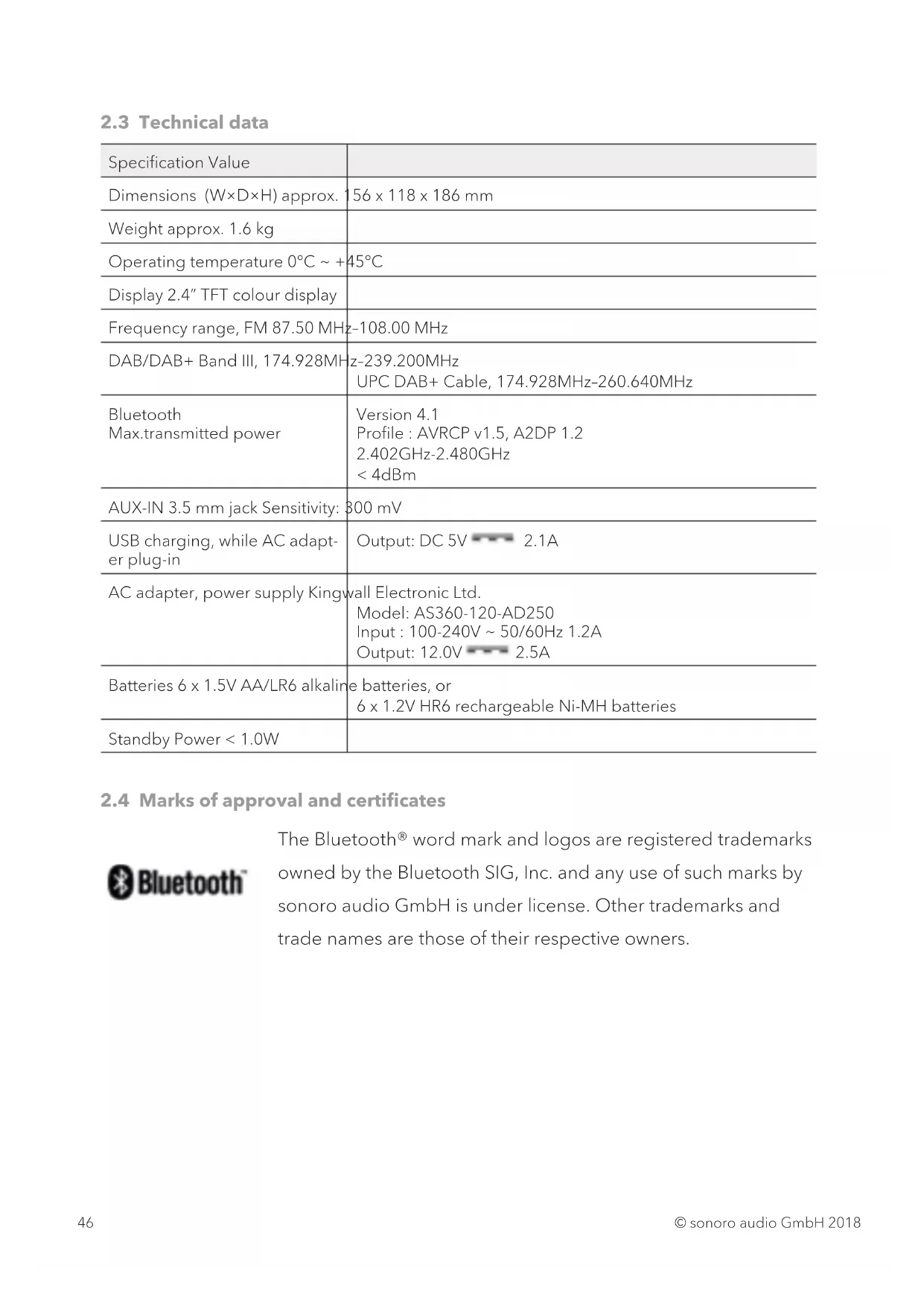 The Bluetooth® word mark and logos are registered trademarks owned by the Bluetooth SIG, Inc. and any use of such marks by sonoro audio GmbH is under license. Other trademarks and trade names are those of their respective owners.© sonoro audio GmbH 2018 47