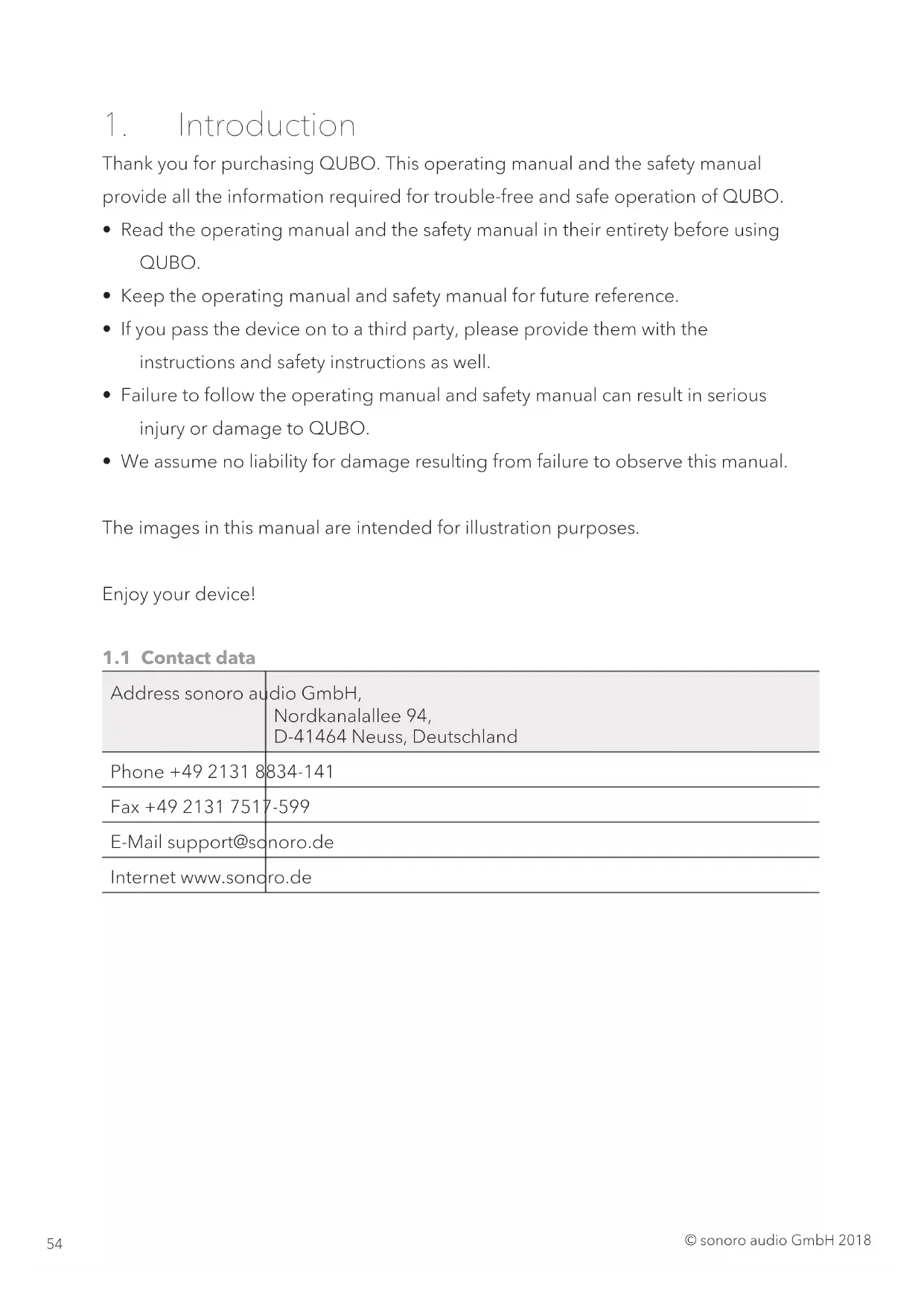 - In case of a complaint, please contact our customer service department. You can find contact details under ‘Contact data’ on page 54 or at www.sonoro.de.