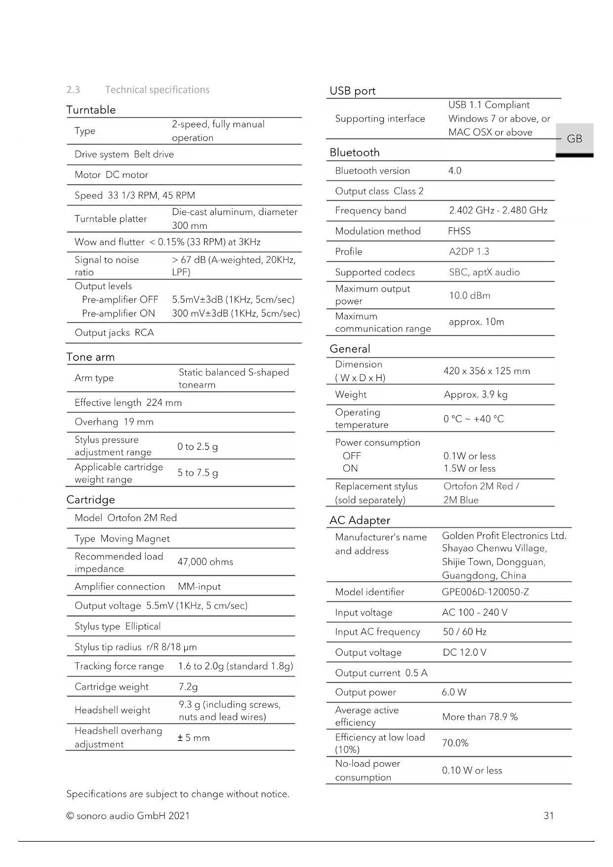 Excluded from the warranty is damage caused by improper use, normal wear and tear, as well as defects which only minimally affect the value or usability of PLATINUM. The warranty also expires in case of any modifications not made by our authorized service center.sonoro.de48 © sonoro audio GmbH 2021 PLATINUM SO-2000 PLATINE VINYLE