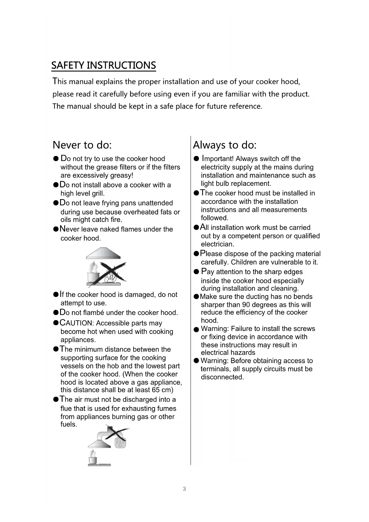 This manual explains the proper installation and use of your cooker hood, please read it carefully before using even if you are familiar with the product. The manual should be kept in a safe place for future reference.