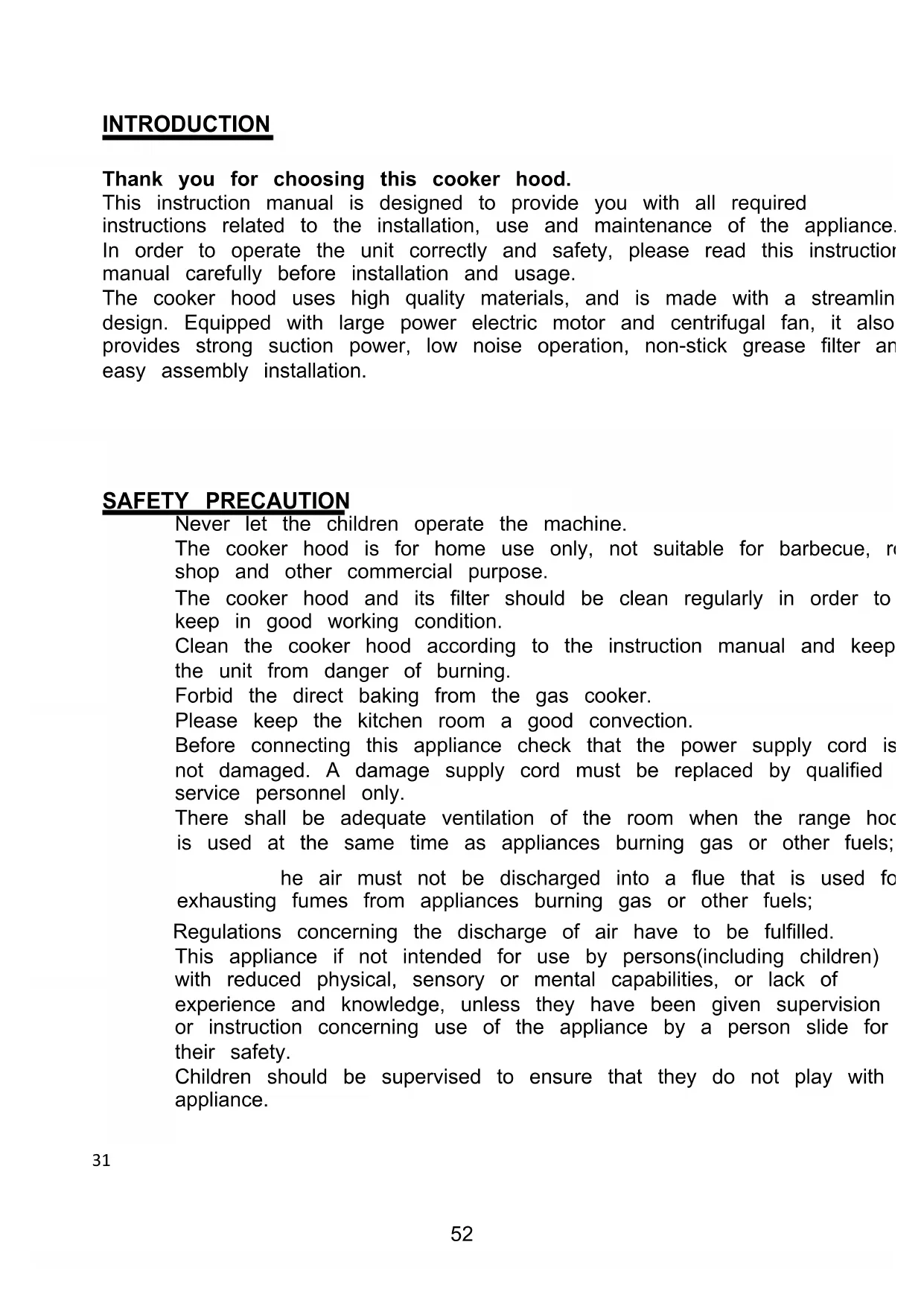 INTRODUCTION Thank you for choosing this cooker hood. This instruction manual is designed to provide you with all required instructions related to the installation, use and maintenance of the appliance. In order to operate the unit correctly and safety, please read this instruction manual carefully before installation and usage. The cooker hood uses high quality materials, and is made with a streamlined design. Equipped with large power electric motor and centrifugal fan, it also provides strong suction power, low noise operation, non-stick grease filter and easy assembly installation. SAFETY PRECAUTION Never let the children operate the machine. The cooker hood is for home use only, not suitable for barbecue, roast shop and other commercial purpose. The cooker hood and its filter should be clean regularly in order to keep in good working condition. Clean the cooker hood according to the instruction manual and keep the unit from danger of burning. Forbid the direct baking from the gas cooker. Please keep the kitchen room a good convection. Before connecting this appliance check that the power supply cord is not damaged. A damage supply cord must be replaced by qualified service personnel only. There shall be adequate ventilation of the room when the range hood is used at the same time as appliances burning gas or other fuels; he air must not be discharged into a flue that is used for exhausting fumes from appliances burning gas or other fuels; Regulations concerning the discharge of air have to be fulfilled. This appliance if not intended for use by persons(including children) with reduced physical, sensory or mental capabilities, or lack of experience and knowledge, unless they have been given supervision or instruction concerning use of the appliance by a person slide for their safety. Children should be supervised to ensure that they do not play with the appliance.
