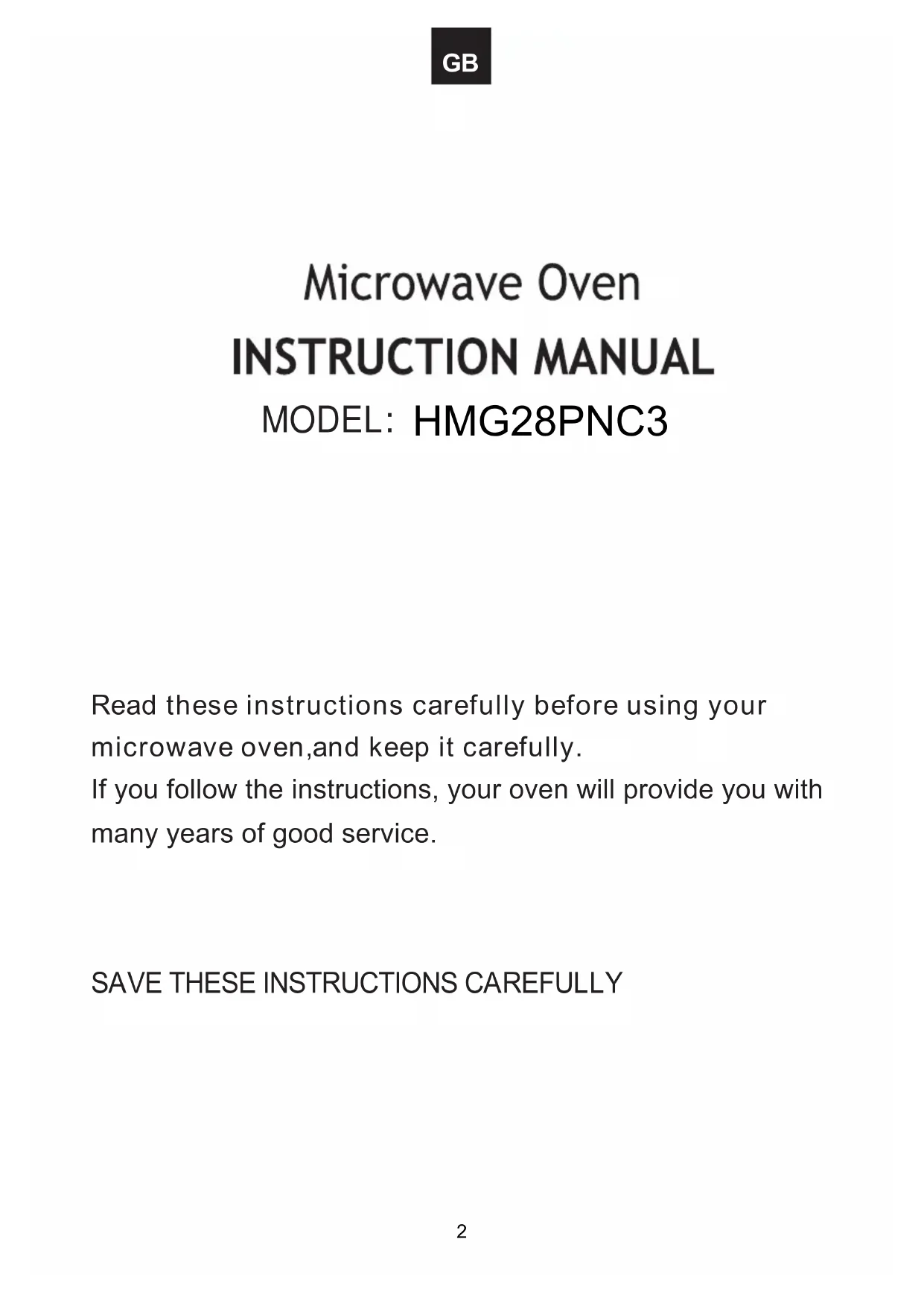 Read these instructions carefully before using your microwave oven,and keep it carefully. If you follow the instructions, your oven will provide you with many years of good service. MODEL: HMG28PNC3 2GB Model:Rated Voltage:Rated Input Power(Microwave):Rated Output Power(Microwave):Rated Input Power(Grill):Oven Capacity:Turntable Diameter:External Dimensions:Net Weight: 230V~50Hz 1450W Approx.