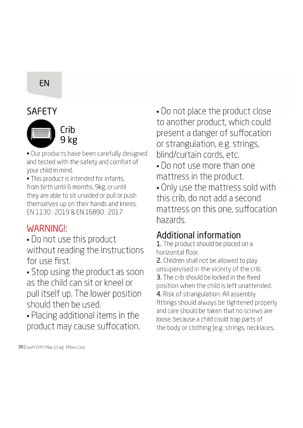 that there is no risk of swing impact (e.g. no risk of the child hitting the crib frame, or the crib hitting other furniture). Cot 15 kg