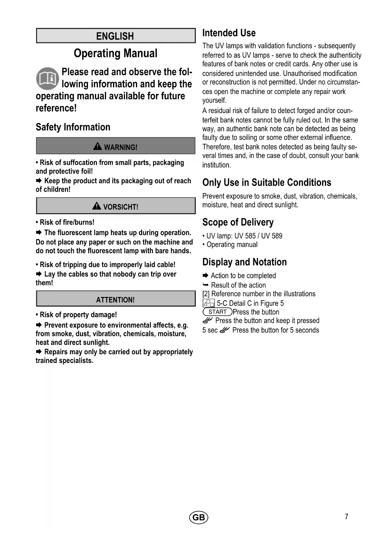 - Risk of property damage! Prevent exposure to environmental affects, e.g. from smoke, dust, vibration, chemicals, moisture, heat and direct sunlight. Repairs may only be carried out by appropriately trained specialists. Intended Use The UV lamps with validation functions - subsequently referred to as UV lamps - serve to check the authenticity features of bank notes or credit cards. Any other use is considered unintended use. Unauthorised modification or reconstruction is not permitted. Under no circumstan ces open the machine or complete any repair work yourself. A residual risk of failure to detect forged and/or coun terfeit bank notes cannot be fully ruled out. In the same way, an authentic bank note can be detected as being faulty due to soiling or some other external influence. Therefore, test bank notes detected as being faulty se veral times and, in the case of doubt, consult your bank institution. Only Use in Suitable Conditions Prevent exposure to smoke, dust, vibration, chemicals, moisture, heat and direct sunlight. Scope of Delivery
