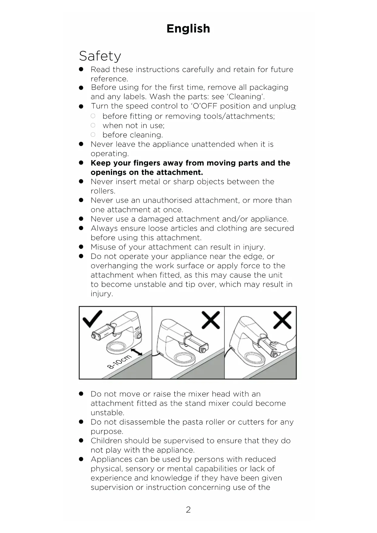Do not operate your appliance near the edge, or overhanging the work surface or apply force to the attachment when fitted, as this may cause the unit to become unstable and tip over, which may result in injury. 8-10cm