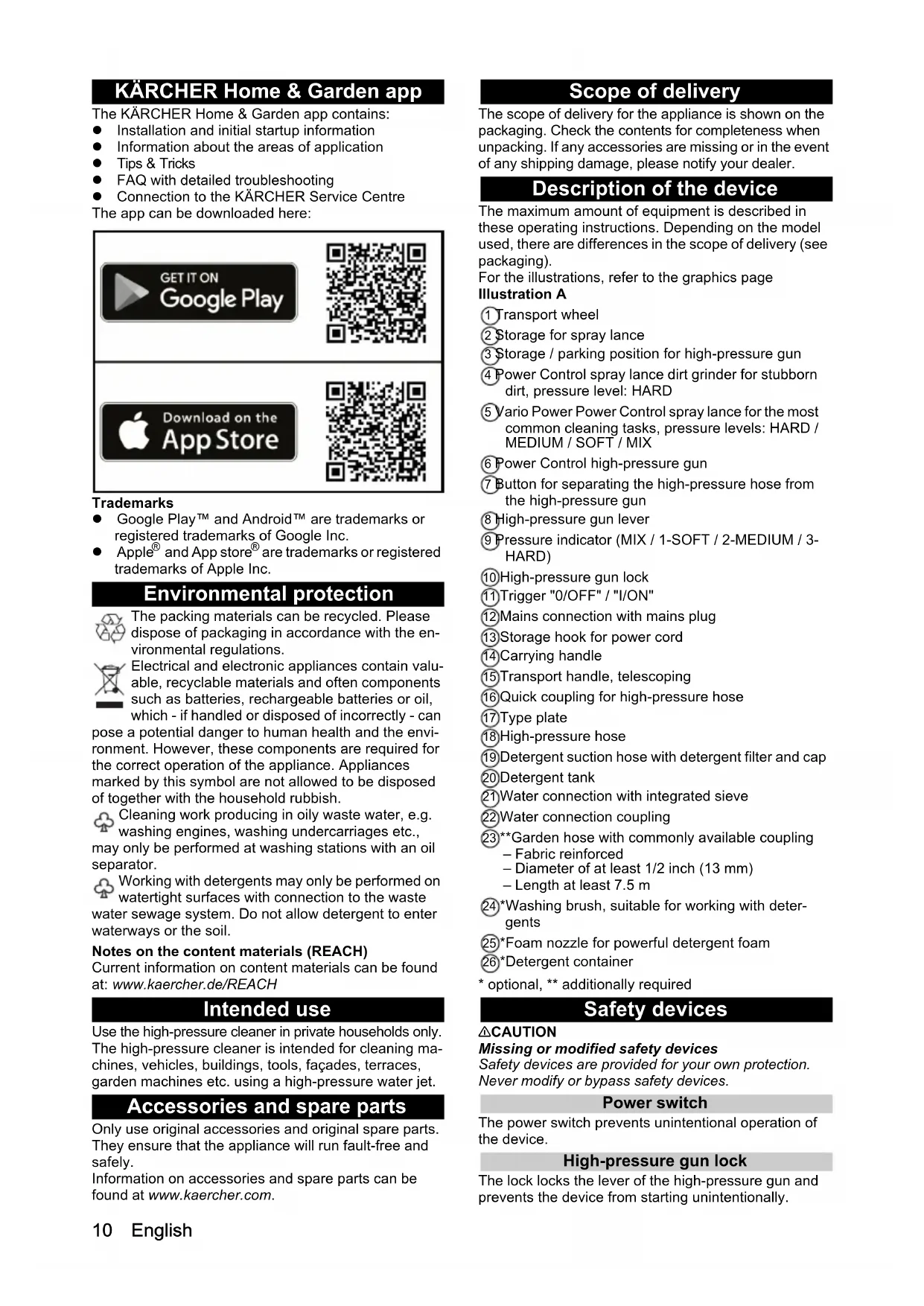 are trademarks or registered trademarks of Apple Inc. Environmental protection The packing materials can be recycled. Please dispose of packaging in accordance with the en- vironmental regulations. Electrical and electronic appliances contain valu- able, recyclable materials and often components such as batteries, rechargeable batteries or oil, which - if handled or disposed of incorrectly - can pose a potential danger to human health and the envi- ronment. However, these components are required for the correct operation of the appliance. Appliances marked by this symbol are not allowed to be disposed of together with the household rubbish. Cleaning work producing in oily waste water, e.g. washing engines, washing undercarriages etc., may only be performed at washing stations with an oil separator. Working with detergents may only be performed on watertight surfaces with connection to the waste water sewage system. Do not allow detergent to enter waterways or the soil. Notes on the content materials (REACH) Current information on content materials can be found at: www.kaercher.de/REACH Intended use Use the high-pressure cleaner in private households only. The high-pressure cleaner is intended for cleaning ma- chines, vehicles, buildings, tools, façades, terraces, garden machines etc. using a high-pressure water jet. Accessories and spare parts Only use original accessories and original spare parts. They ensure that the appliance will run fault-free and safely. Information on accessories and spare parts can be found at www.kaercher.com. Scope of delivery The scope of delivery for the appliance is shown on the packaging. Check the contents for completeness when unpacking. If any accessories are missing or in the event of any shipping damage, please notify your dealer. Description of the device The maximum amount of equipment is described in these operating instructions. Depending on the model used, there are differences in the scope of delivery (see packaging). For the illustrations, refer to the graphics page Illustration A 1 Transport wheel 2 Storage for spray lance 3 Storage / parking position for high-pressure gun 4 Power Control spray lance dirt grinder for stubborn dirt, pressure level: HARD 5 Vario Power Power Control spray lance for the most common cleaning tasks, pressure levels: HARD /