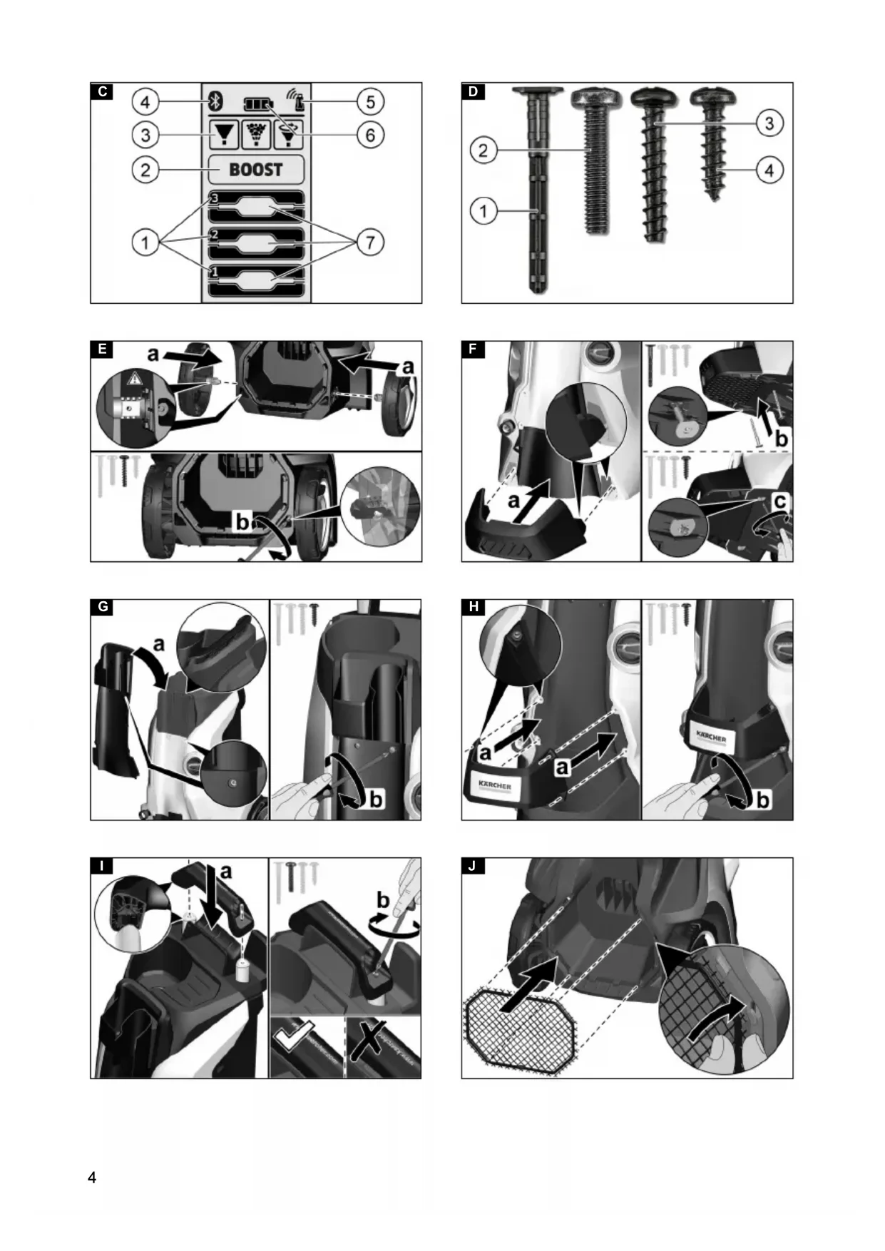 connection 5 Signal strength status (four levels) 6 Battery status (empty, almost empty, medium, full) 7 Detergent level (1 / 2 / 3) Supplied screws and dowels Illustration D 1 Stand dowels (2 pieces) 2 Screw M 4x20 (2 pieces) 3 Screw M 4x22 (2 pieces) 4 Screw M 4x16 (8 pieces) Safety devices 몇 CAUTION Missing or modified safety devices Safety devices are provided for your own protection. Never modify or bypass safety devices. Power switch The power switch prevents unintentional operation of the device. High-pressure gun lock The lock locks the lever of the high-pressure gun and prevents the device from starting unintentionally. Auto-stop function If the lever of the high-pressure gun is released, the pressure switch turns off the pump and the high-pres- sure jet stops. The pump switches on again when the le- ver is pressed. Motor circuit breaker The motor circuit breaker shuts off the device if power consumption it too high. Symbols on the device Assembly For the illustrations, refer to the graphics page. Place the screws provided and matching screwdriver at the ready. Fit the supplied loose parts onto the device before start- ing up the device. Fitting the wheels