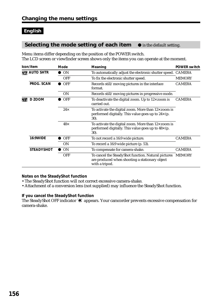 Index A, B A/V connecting cable 44, 105, 128 AC power adaptor 14 Adjusting shutter speed 64 Adjusting viewfinder 28 AE SHIFT 75 Audio dubbing 135 AUDIO LEVEL 73 AUDIO MIX 157 Audio mode 159 AUTO SHTR 156 BACK LIGHT 32 Battery pack 13 BEEP 161