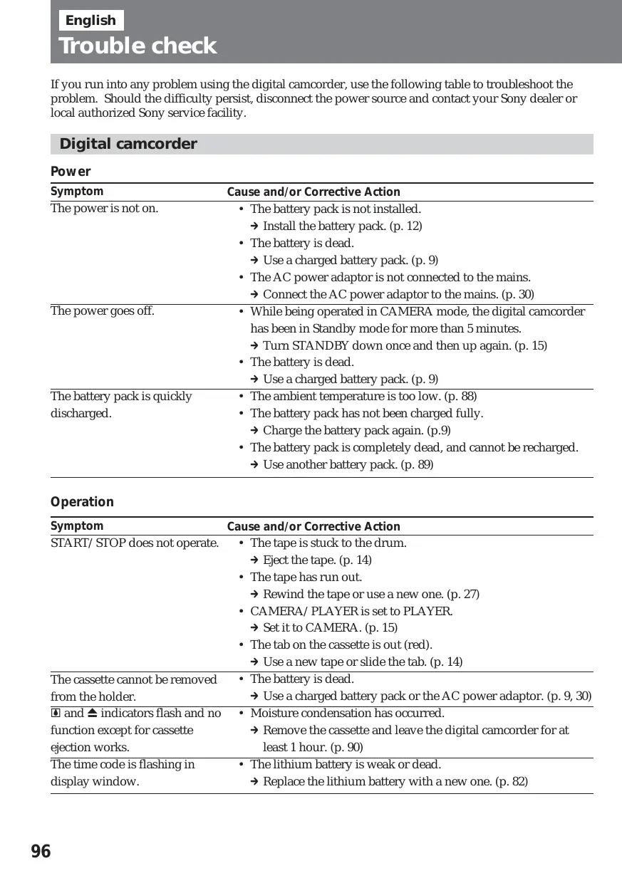 Using your digital camcorder abroad Each country or area has its own electric and TV colour systems. Before using your digital camcorder abroad, check the following points. Power sources You can use your digital camcorder in any country or area with the supplied AC power adaptor within 100 V to 240 V AC, 50/60 Hz. This digital camcorder is a PAL system based digital camcorder. If you want to view the playback picture on a TV, it must be a PAL system based TV. Check the following list. PAL-M system Brazil PAL-N system Argentina, Paraguay, Uruguay NTSC system Bahama Islands, Bolivia, Canada, Central America, Chile, Colombia, Ecuador, Jamaica, Japan, Korea, Mexico, Peru, Surinam, Taiwan, the Philippines, the U.S.A., Venezuela, etc. SECAM system Bulgaria, France, Guyana, Hungary, Iran, Iraq, Monaco, Poland, Russia, Ukraine, etc. PAL system Australia, Austria, Belgium, China, Czech Republic, Denmark, Finland, Germany, Great Britain, Holland, Hong Kong, Italy, Kuwait, Malaysia, New Zealand, Norway, Portugal, Singapore, Slovak Republic, Spain, Sweden, Switzerland, Thailand, etc. Difference in colour systems Trouble check If you run into any problem using the digital camcorder, use the following table to troubleshoot the problem. Should the difficulty persist, disconnect the power source and contact your Sony dealer or local authorized Sony service facility. Digital camcorder Power Symptom The power is not on. The power goes off. The battery pack is quickly discharged. Cause and/or Corrective Action