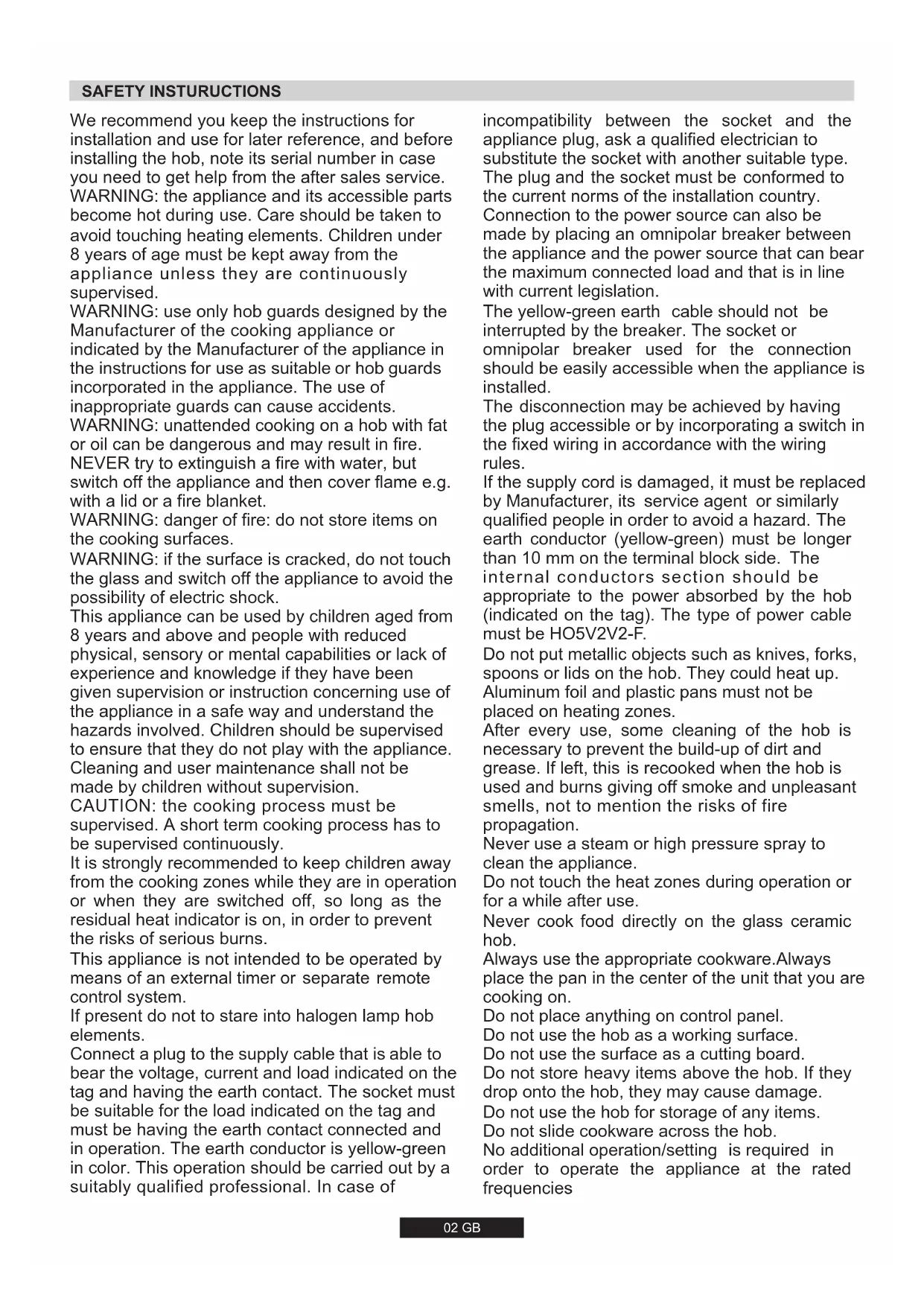 ВАРИЛЬНІ ПОВЕРХНІ ІНСТРУКЦІЯ З ЕКСПЛУАТАЦІЇ UK 6002 GB SAFETY INSTURUCTIONS We recommend you keep the instructions for installation and use for later reference, and before installing the hob, note its serial number in case you need to get help from the after sales service.