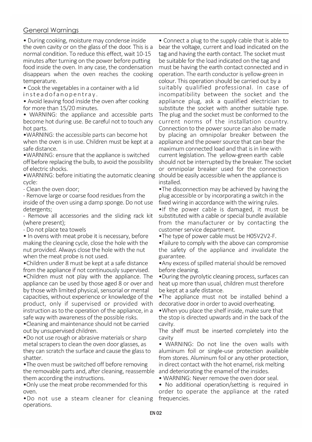 ENSURE THAT AN ELECTRICIAN OR QUALIFIED TECHNICIAN MAKES THE ELECTRICAL CONNECTIONS. The power supply to which the oven is connected must conform with the laws in force in the country of installation. The manufacturer accepts no responsibility for any damage caused by the failure to observe these instructions. The oven must be connected to an electrical supply with an earthed wall outlet or a disconnector with multiple poles, depending on the laws in force in the country of installation. The electrical supply should be protected with suitable fuses and the cables used must have a transverse section that can ensurecorrectsupplyto the oven. CONNECTION - the settingof the disconnector. The grounding wire connected to the oven's earth terminal must be connectedtothe earth terminal of the powersupply. WARNING NOTE: as the oven could require maintenance work, it is advisable to keep another wall socket available so that the oven can be connected to this if it is removed from the space in which it is installed. The power cable must only be substituted by technical service staff or by technicians with equivalentqualifications. - power voltageindicated on the gauge; The oven is supplied with a power cable that should only be connected to an electrical supply with 220-240 Vac 50 Hz power between the phases or between the phase and neutral. Before the oven is connected to the electricalsupply, it is important to check: Before connecting the oven to the power supply, ask a qualified electrician to check the continuity of the power supply's earth terminal. The manufacturer accepts no responsibility for any accidents or other problems caused by failure to connect the oven to the earth terminal or by an earth connectionthat has defective continuity.