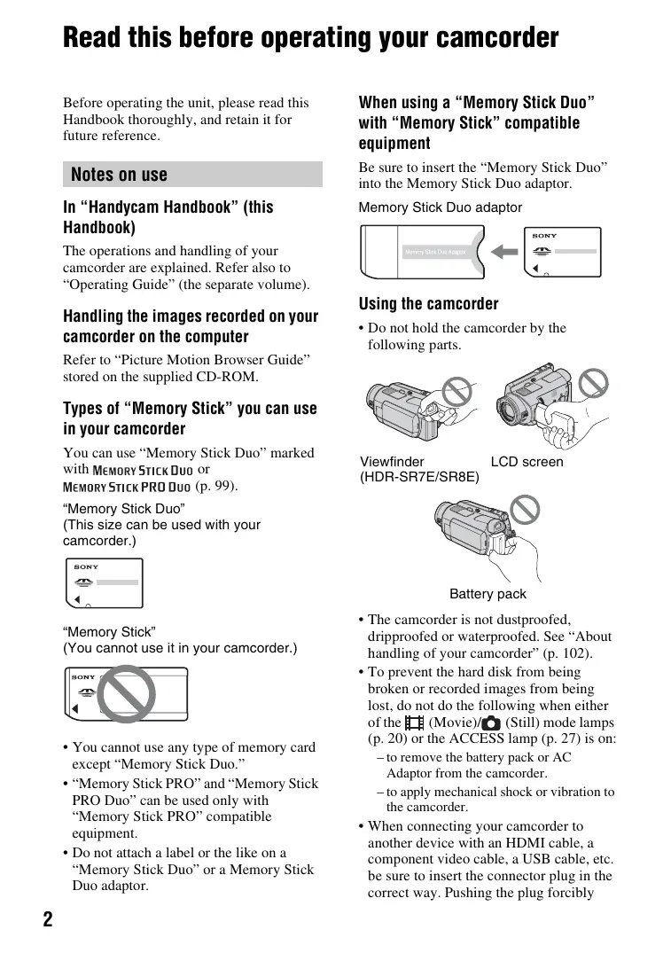 - Do not hold the camcorder by the following parts. Refer to “Picture Motion Browser Guide” stored on the supplied CD-ROM. Types of “Memory Stick” you can use in your camcorder You can use “Memory Stick Duo” marked with (p. 99). Viewfinder LCD screen (HDR-SR7E/SR8E) “Memory Stick Duo” (This size can be used with your camcorder.) Battery pack “Memory Stick” (You cannot use it in your camcorder.)