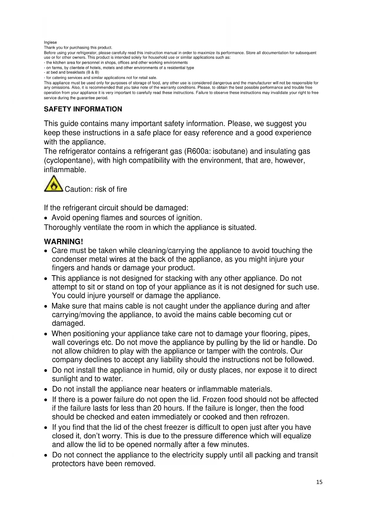- SCRAPPING OLD APLIANCES Inglese Thank you for purchasing this product. Before using your refrigerator, please carefully read this instruction manual in order to maximize its performance. Store all documentation for subsequent use or for other owners. This product is intended solely for household use or similar applications such as: - the kitchen area for personnel in shops, offices and other working environments - on farms, by clientele of hotels, motels and other environments of a residential type - at bed and breakfasts (B & B) - for catering services and similar applications not for retail sale. This appliance must be used only for purposes of storage of food, any other use is considered dangerous and the manufacturer will not be responsible for any omissions. Also, it is recommended that you take note of the warranty conditions. Please, to obtain the best possible performance and trouble free operation from your appliance it is very important to carefully read these instructions. Failure to observe these instructions may invalidate your right to free service during the guarantee period. SAFETY INFORMATION This guide contains many important safety information. Please, we suggest you keep these instructions in a safe place for easy reference and a good experience with the appliance. The refrigerator contains a refrigerant gas (R600a: isobutane) and insulating gas (cyclopentane), with high compatibility with the environment, that are, however, inflammable. Caution: risk of fire If the refrigerant circuit should be damaged: p. 2515