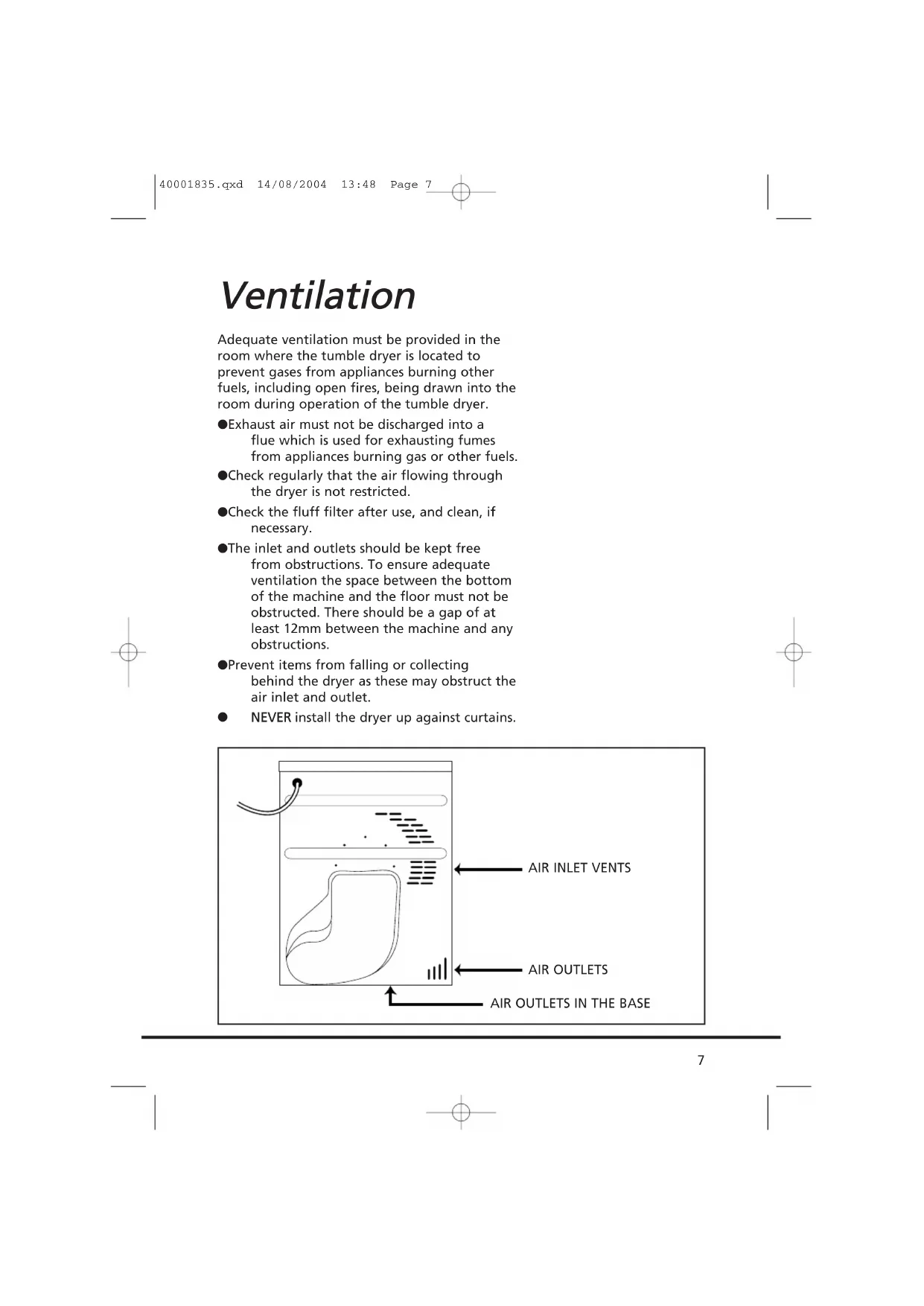 40001835.qxd 14/08/2004 13:48 Page 7Before using the tumble dryer for the first time: ● Please read this instruction book thoroughly. ● Remove all items packed inside drum. ● Wipe the inside of the drum and door with a damp cloth to remove any dust which may have settled in transit. CCllootthheess pprreeppaarraattiioonn Make sure that the laundry you are going to dry is suitable for drying in a tumble dryer, as shown by the care symbols on each item. Check that all fastenings are closed and that pockets are empty. Turn the articles inside out. Place clothes loosely in the drum to make sure that they don't get tangled. MMaaxxiimmuumm ddrryyiinngg wweeiigghhtt ● Cottons Max. 7 kg ● Synthetics Max. 3.5 kg