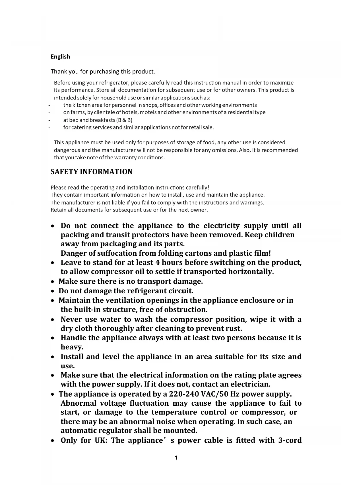 LANGUAGES English 1 Čeština 17 Español 33 Français 50 Italiano 67 Nederlands 84 Polskie 100 Português 117 Slovák 1331 English Thank you for purchasing this product. Before using your refrigerator, please carefully read this instruction manual in order to maximize its performance. Store all documentation for subsequent use or for other owners. This product is intended solely for household use or similar applications such as: - the kitchen area for personnel in shops, offices and other working environments - on farms, by clientele of hotels, motels and other environments of a residential type - at bed and breakfasts (B & B) - for catering services and similar applications not for retail sale. This appliance must be used only for purposes of storage of food, any other use is considered dangerous and the manufacturer will not be responsible for any omissions. Also, it is recommended that you take note of the warranty conditions. SAFETY INFORMATION Please read the operating and installation instructions carefully! They contain important information on how to install, use and maintain the appliance. The manufacturer is not liable if you fail to comply with the instructions and warnings. Retain all documents for subsequent use or for the next owner. Do not connect the appliance to the electricity supply until all packing and transit protectors have been removed. Keep children away from packaging and its parts. Danger of suffocation from folding cartons and plastic film! Leave to stand for at least 4 hours before switching on the product, to allow compressor oil to settle if transported horizontally. Make sure there is no transport damage. Do not damage the refrigerant circuit. Maintain the ventilation openings in the appliance enclosure or in the built-in structure, free of obstruction. Never use water to wash the compressor position, wipe it with a dry cloth thoroughly after cleaning to prevent rust. Handle the appliance always with at least two persons because it is heavy. Install and level the appliance in an area suitable for its size and use. Make sure that the electrical information on the rating plate agrees with the power supply. If it does not, contact an electrician. The appliance is operated by a 220-240 VAC/50 Hz power supply. Abnormal voltage fluctuation may cause the appliance to fail to start, or damage to the temperature control or compressor, or there may be an abnormal noise when operating. In such case, an automatic regulator shall be mounted. Only for UK: The appliance’s power cable is fitted with 3-cord2 (grounding) plug that fits a standard 3-cord (grounded) socket. Never cut off or dismount the third pin (grounding). After the ap- pliance is installed, the plug should be accessible. Make sure that mains cable is not caught under the appliance during and after carrying/moving the appliance, to avoid the mains cable becoming cut or damaged. If the supply cord is damaged, it must be replaced by the manufacturer, its service agent or similarly qualified person in order to avoid a hazard. Do not install the appliance in humid, oily or dusty places, nor expose it to direct sunlight and to water. Do not install the appliance near heaters or inflammable materials. FOR appliances with a freezer compartment: if there is a power failure do not open the lid. Frozen food should not be affected if the failure lasts for less than the hours indicated on the rating label (Temperature rise time). If the failure is longer, then the food should be checked and eaten immediately or cooked and then refrozen. If you find that the lid of the appliance is difficult to open just after you have closed it, don’t worry. This is due to the pressure difference which will equalize and allow the lid to be opened normally after a few minutes. Do not store medicines, bacteria or chemical agents in the appliance. This appliance is a household appliance, it is not recommended to store materials that require strict temperatures. Do not excessively pull or fold the power cord or touch the plug with wet hands. Do not store products which contain flammable propellant (e.g. spray cans) or explosive substances in the appliance. Risk of explosion! Do not place unstable articles (heavy objects, containers filled with water) on top of the refrigerator, to ovoid personal injury caused by falling or electric shock caused by contact with water. Do not use electrical appliances inside the food storage compartments, unless they are of the type recommended by the manufacturer. Do not touch internal cooling elements, especially with wet hands, to avoid cracks or injuries. At risk here are children, people who have limited physical, mental or sensory abilities, as well as people who have inadequate knowledge concerning safe operation of the appliance. Check that children and vulnerable people have understood the hazards. A person responsible for safety must supervise or instruct children and vulnerable people who are using the appliance. Only3 children aged 8 years and above may use the appliance. Children should not play with the appliance. Children aged from 3 to 8 years are allowed to load and unload this appliance. FOR appliances with a freezer compartment: do not store bottled or canned liquids (especially carbonated drinks) in the freezer compartment. Bottles and cans may burst! FOR appliances with a freezer compartment: never put frozen food straight from the freezer compartment in your mouth. Risk of low- temperature burns! Keep plastic parts and the door seal free of oil and grease. Otherwise, plastic parts and the door seal will become porous. Before performing any operation, unplug the power cord from the power socket. Do not use mechanical devices or other means to accelerate the defrosting process, other than those recommended by the manufacturer. Do not use pointed or sharp-edged objects such as knives or forks to remove the frost. Never use hairdryers, electrical heaters or other such electrical appli