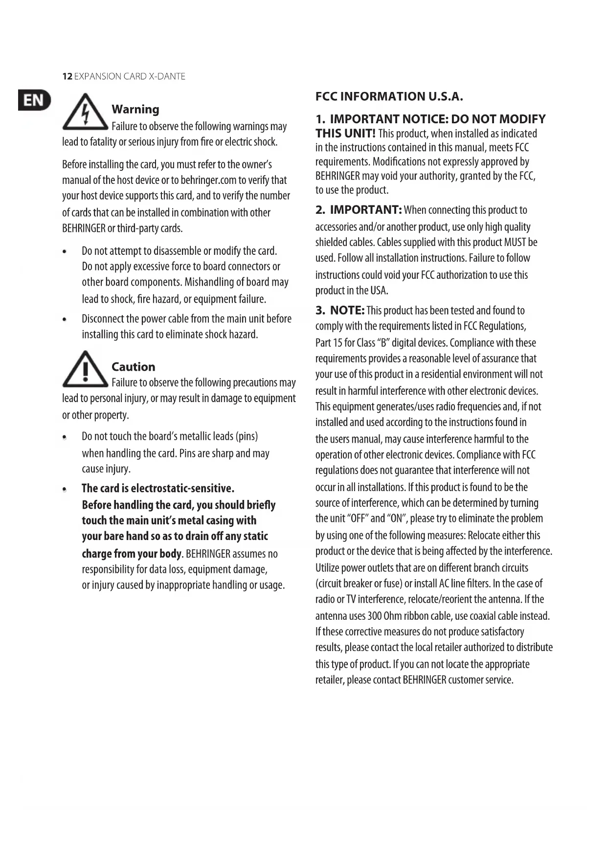 requirements provides a reasonable level of assurance that your use of this product in a residential environment will not result in harmful interference with other electronic devices. This equipment generates/uses radio frequencies and, if not installed and used according to the instructions found in the users manual, may cause interference harmful to the operation of other electronic devices. Compliance with FCC regulations does not guarantee that interference will not occur in all installations. If this product is found to be the source of interference, which can be determined by turning the unit “OFF” and “ON”, please try to eliminate the problem by using one of the following measures: Relocate either this product or the device that is being aected by the interference. Utilize power outlets that are on dierent branch circuits (circuit breaker or fuse) or install AC line lters. In the case of radio or TV interference, relocate/reorient the antenna. If the antenna uses 300Ohm ribbon cable, use coaxial cable instead. If these corrective measures do not produce satisfactory results, please contact the local retailer authorized to distribute this type of product. If you can not locate the appropriate retailer, please contact BEHRINGER customer service. FCC INFORMATION U.S.A. 12 EXPANSION CARD X-DANTE13Quick Start Guide