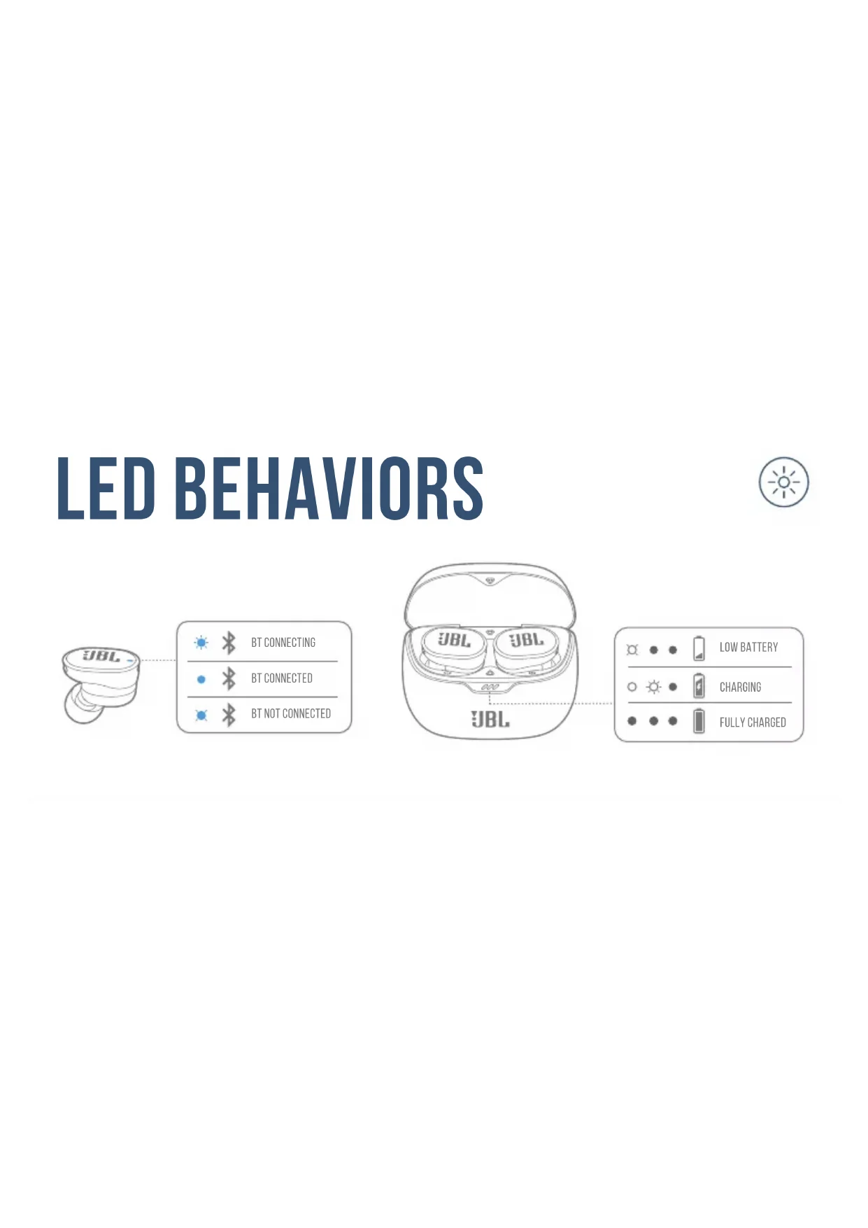 Charging case: 42 g/ 0.093 lbs Earbud battery type: Lithium-ion Battery (70 mAh/ 3.85 V) Charging case battery type: Lithium-ion Battery (750 mAh/ 3.7 V) Charging time: 2 hrs from empty Music playtime with BT on and ANC o: Up to 12 hrs Music playtime with BT on and ANC on: Up to 10 hrs Talk time with ANC on: Up to 6 hrs Talk time with ANC o: Up to 6.6 hrs Frequency response: 20 Hz – 20 kHz Impedance: 32 ohm Sensitivity: 101 dB SPL@1 kHz Maximum SPL: 93 dB Microphone sensitivity: -38 dBV/Pa@1 kHz Bluetooth version: 5.3 Bluetooth prole version: A2DP V1.3.2, AVRCP V1.6.2, HFP V1.8 Bluetooth transmitter frequency range: 2.4 GHz – 2.4835 GHz Bluetooth transmitter power: <11 dBm (EIRP) Bluetooth transmitter modulation: GFSK, π/4-DQPSK, 8-DPSK Maximum operation temperature: 45 °C led behaviors BT connecting BT connected BT not connected CHARGING LOW BATTERY FULLY CHARGED IP54FR DA