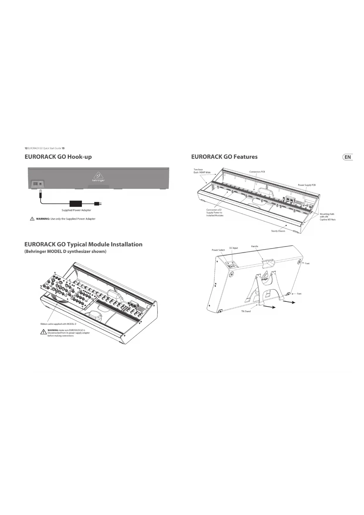 disconnected from its power supply adapter before making any connections Connect End P1 to connector X23 on the MODEL D PCB Connect End P2 to any connector on the EURORACK GO CAUTION: Due to the power requirements of the MODEL D, do not connect any other modules to the same Zone (A, B, or C) on the EURORACK GO P1 P2 GATE* CV* +5V* +12V GROUND -12V* *(not connected to MODEL D) Red Stripe16 EURORACK GO Quick Start Guide 17 Specications Connectivity Rear panel DC Power input Power switch (toggle) Power Requirements External power adaptor (use only the supplied adapter) 13 VDC, 5A Power consumption 65 W maximum PCB Connectors Quantity 20, box header, straight, 16 pin, 2 rows, pitch 2.54 mm Quantity 12, box header, angled 90 degrees, 16 pin, 2 rows, pitch 2.54 mm Power bus outputs and pin outs +5 VDC @1 A ( All zone total), pins 11, 12 -12VDC @ 1 A ( All zone total), pins 1, 2 +12 VDC @ 1 A ( Section A total), pins 9, 10 +12 VDC @ 1 A ( Section B total), pins 9, 10 +12 VDC @ 1 A ( Section C total), pins 9, 10 Other bus connections and pin outs CV, pins 13, 14 Gate, pins 15, 16 Ground, pins 3, 4, 5, 6, 7, 8 Environmental Operating temperature range 5°C – 40°C (41°F – 104°F) Environment Dry, indoor use only Physical Dimensions (H x W x D) (Flat with tilt- stand stowed) 112 x 723 x 311 mm (4.4 x 28.5 x 12.2") Module width 2 bays of 140 HP each (fully useable width) Maximum depth of module that can be inserted 40 mm (1.57") - 62 mm (2.44") Weight 3.9 kg (8.6 lbs) Accessories Included power adapter EURORACK GO Dimensions
